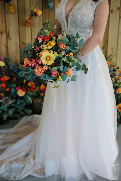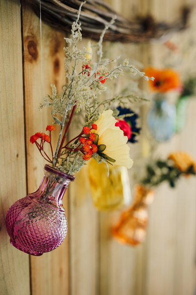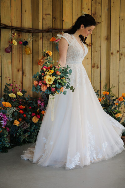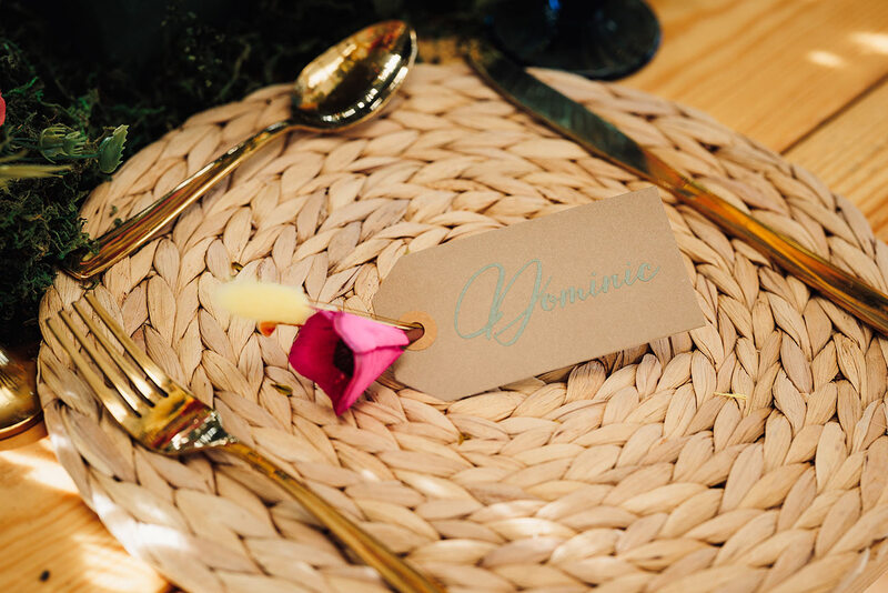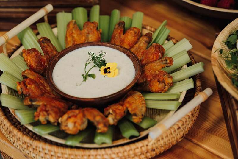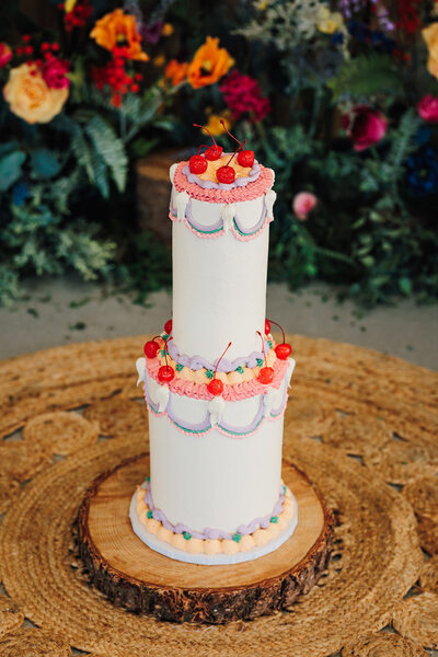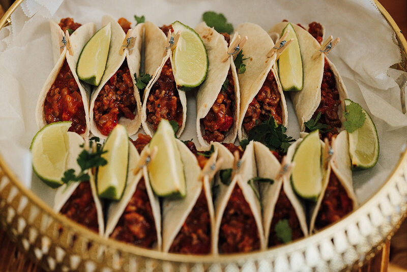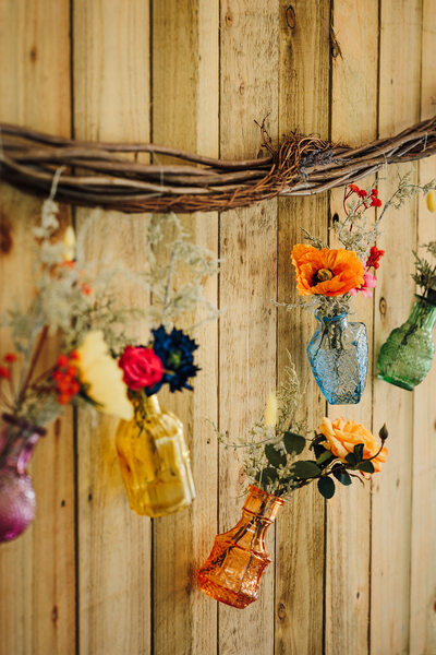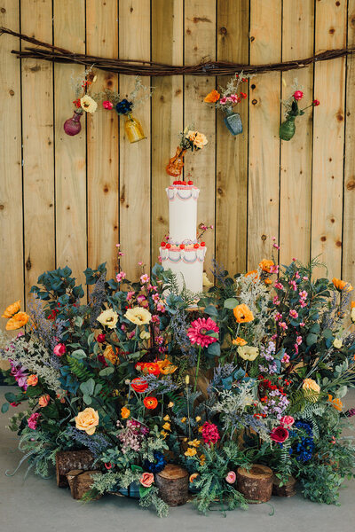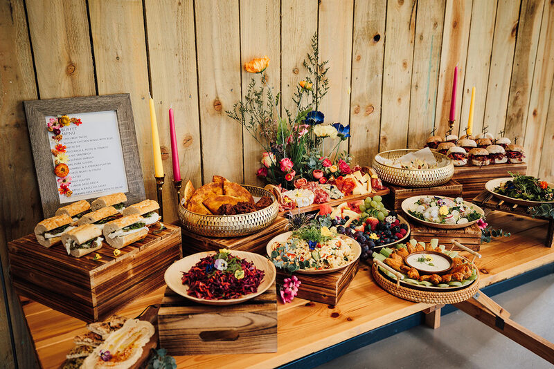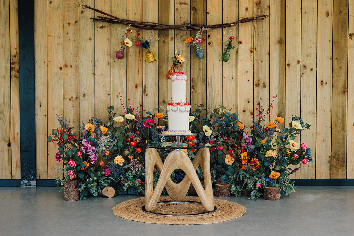 Jewel-toned vases filled with little posies of flowers add interest to the walls of the barn, while the cake – a vintage-inspired confection featuring delicate piping and cherries – makes for a showstopping centrepiece. A grazing table extends the aesthetic: colourful platters of fruits, cheeses and cured meats; salads sprinkled with edible flowers and the delicious likes of chilli beef tacos, vegetable samosas, buffalo chicken wings and barbecue pork sliders makes for the most mouthwatering focal point.