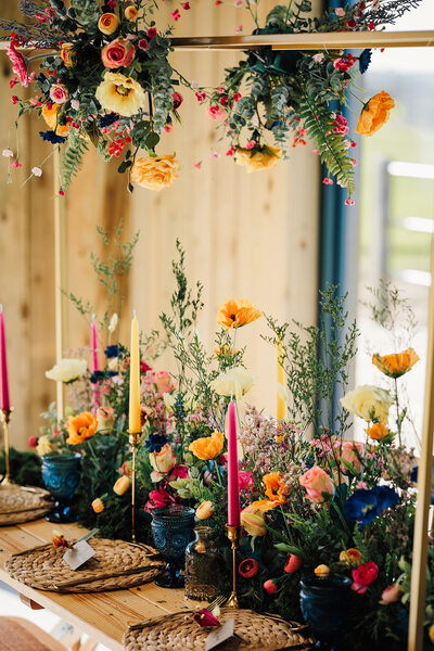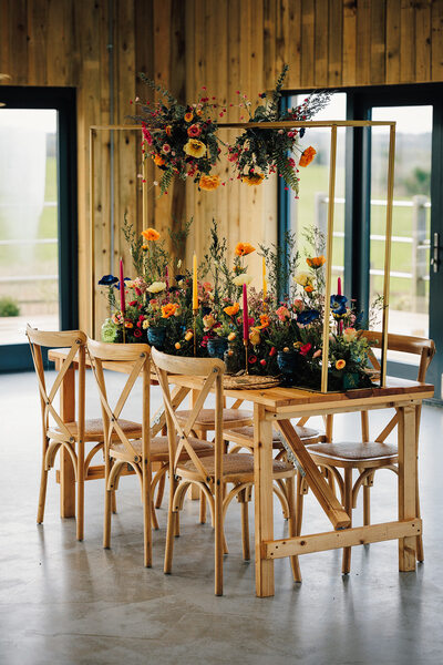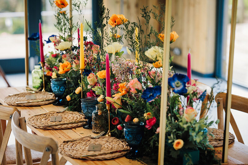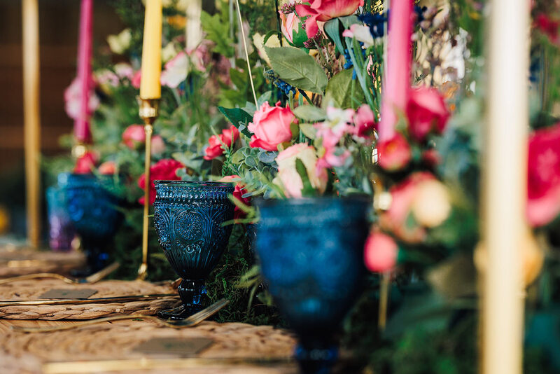 Here, the versatile venue makes the setting for a vibrant and joy-filled rural romance, where an eye-catching palette of oranges, yellows and pinks meet accents of deep blue. Popping beautifully against the warm tones and textures of the barn setting, the tablescape is a carnival of colour, the glorious floral display nestling rattan charger plates, tapered candles and sapphire blue glassware.