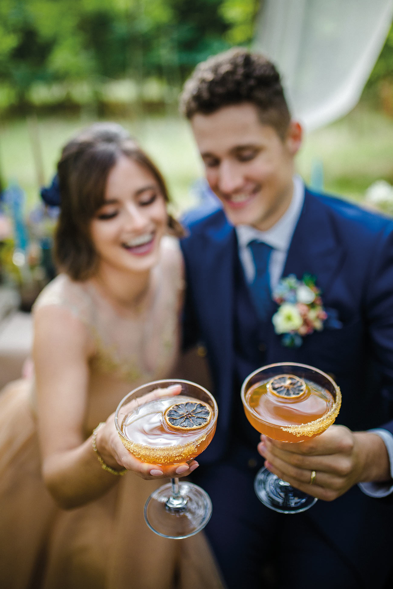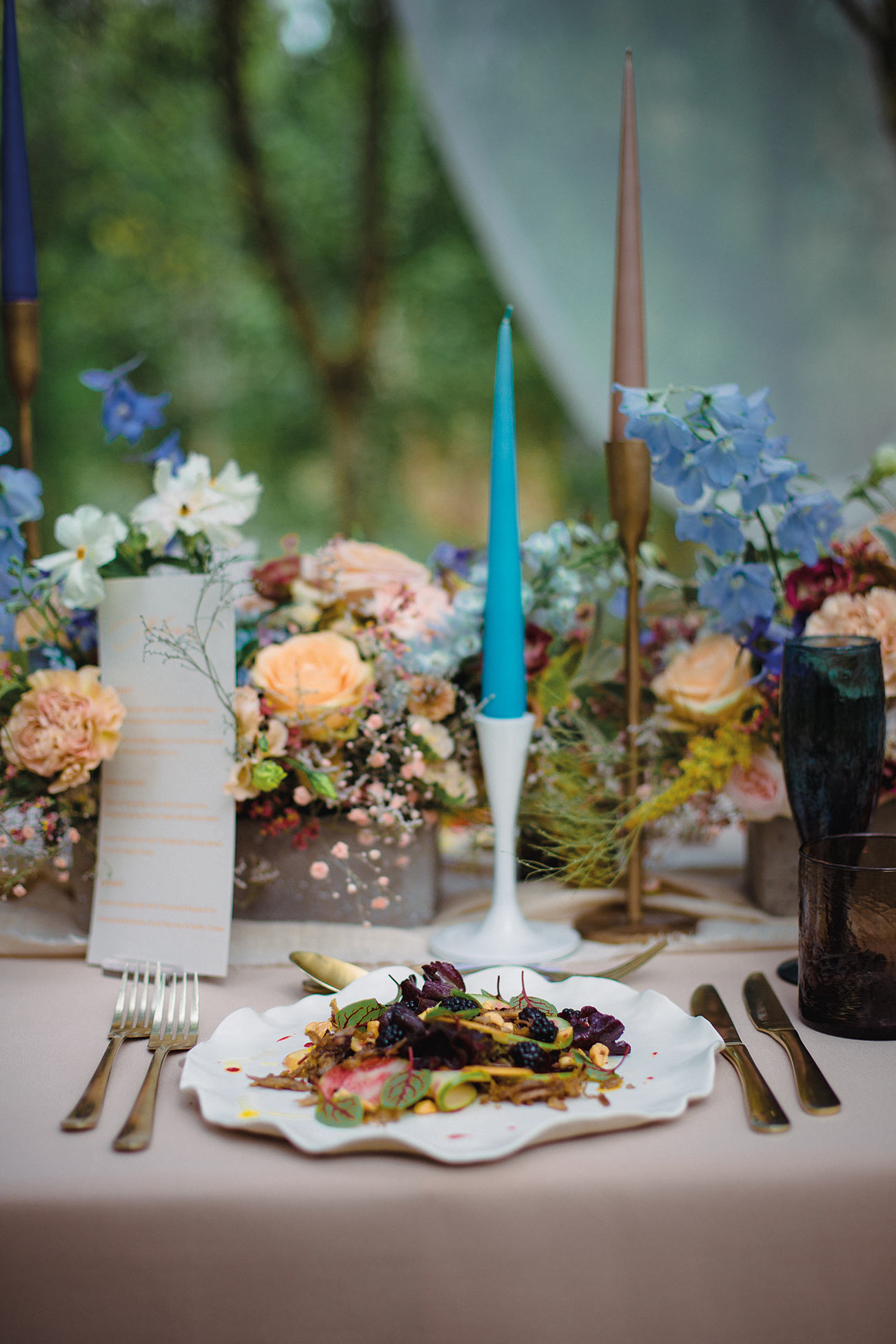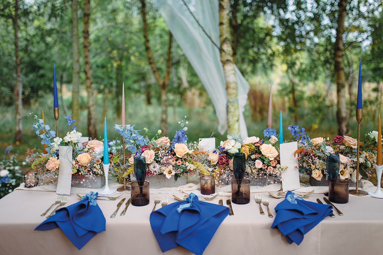 The lush canvas of silver birch trees is painted with the shades of the Abyssinian roller, reflected in every detail from the flowers and dresses to the cocktails. “The bridal gowns, cake and table linen were in the warm toffee and neutral hues of the bird’s body, while the groom’s outfit, florals and napkins were designed to reflect the colours in the wings,” says Natalie.