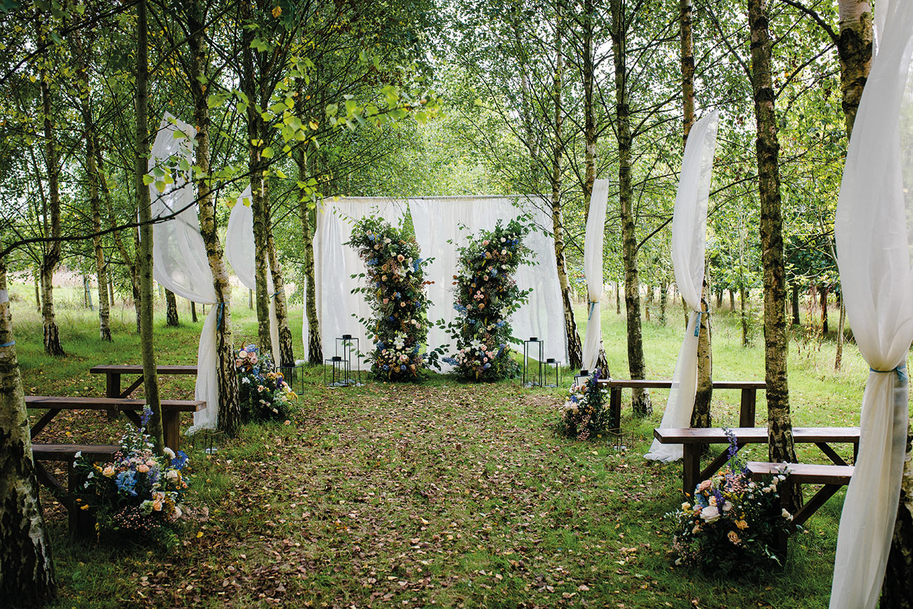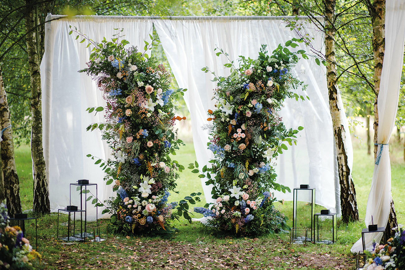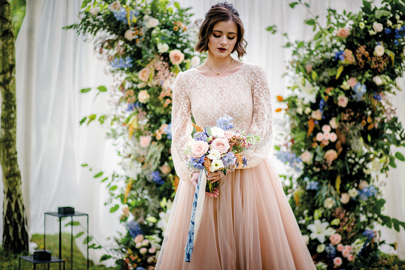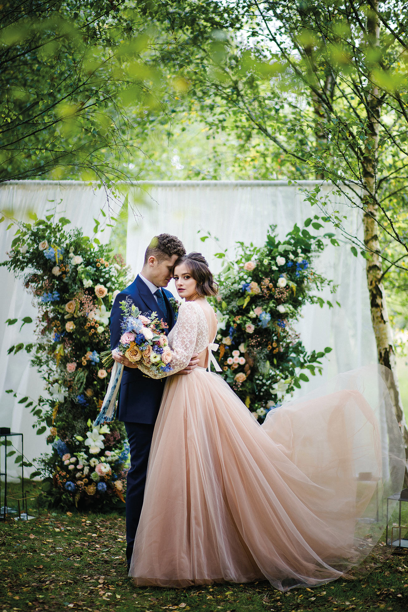 The smaller details, too, add to the endlessly romantic aesthetic, from the handcrafted granulated jewellery and elegant silks to the billowing sleeves of the bridal gown. Striking a luxe and gorgeously ethereal note, the shape of the ceremony backdrop creates the impression of the bird’s wings. Fabric draping along the aisle, together with a backdrop to accentuate the beauty of the wings, adds texture and depth to the glorious natural surroundings. The effect is oh-so beautiful: a slice of paradise in a tucked-away corner of Devon.