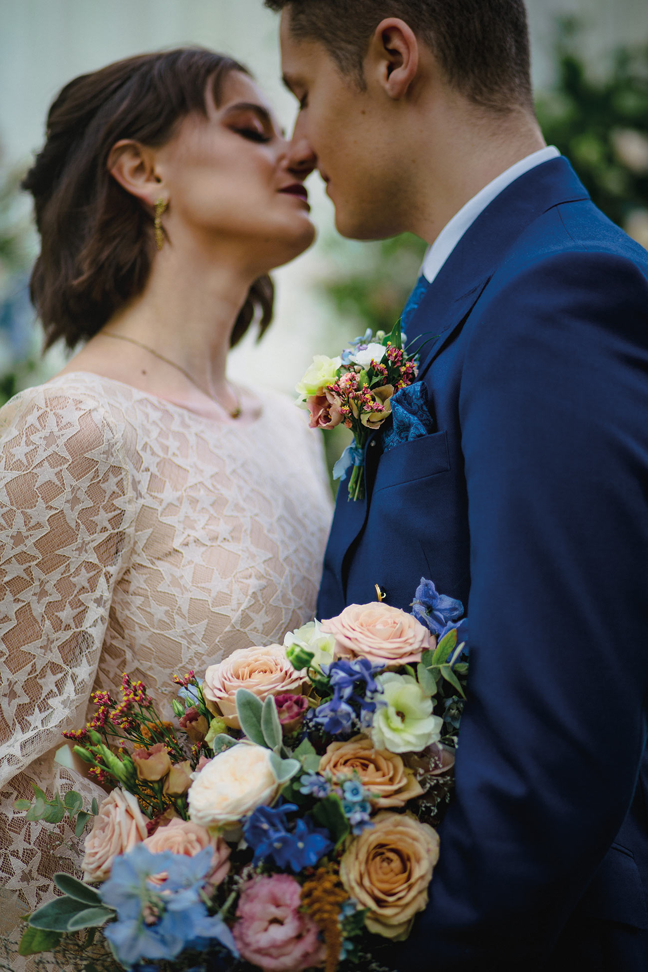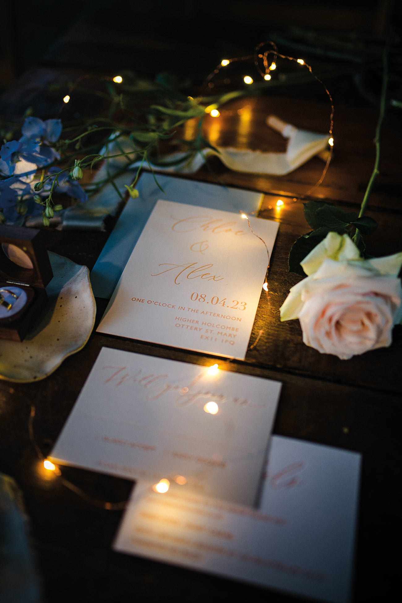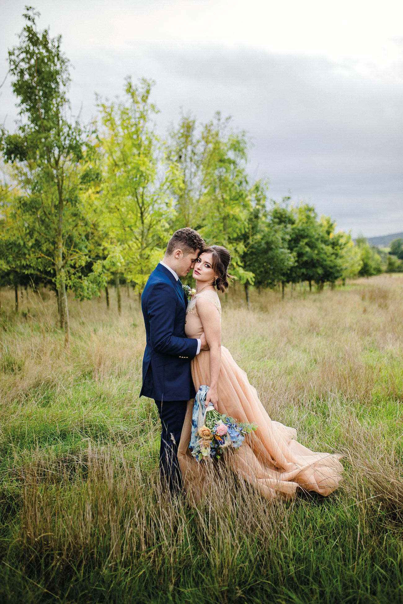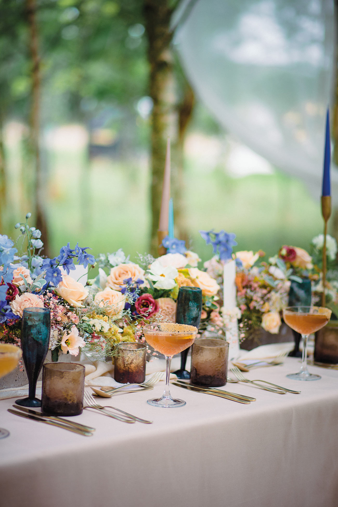 The smaller details, too, add to the endlessly romantic aesthetic, from the handcrafted granulated jewellery and elegant silks to the billowing sleeves of the bridal gown. Striking a luxe and gorgeously ethereal note, the shape of the ceremony backdrop creates the impression of the bird’s wings. Fabric draping along the aisle, together with a backdrop to accentuate the beauty of the wings, adds texture and depth to the glorious natural surroundings. The effect is oh-so beautiful: a slice of paradise in a tucked-away corner of Devon.