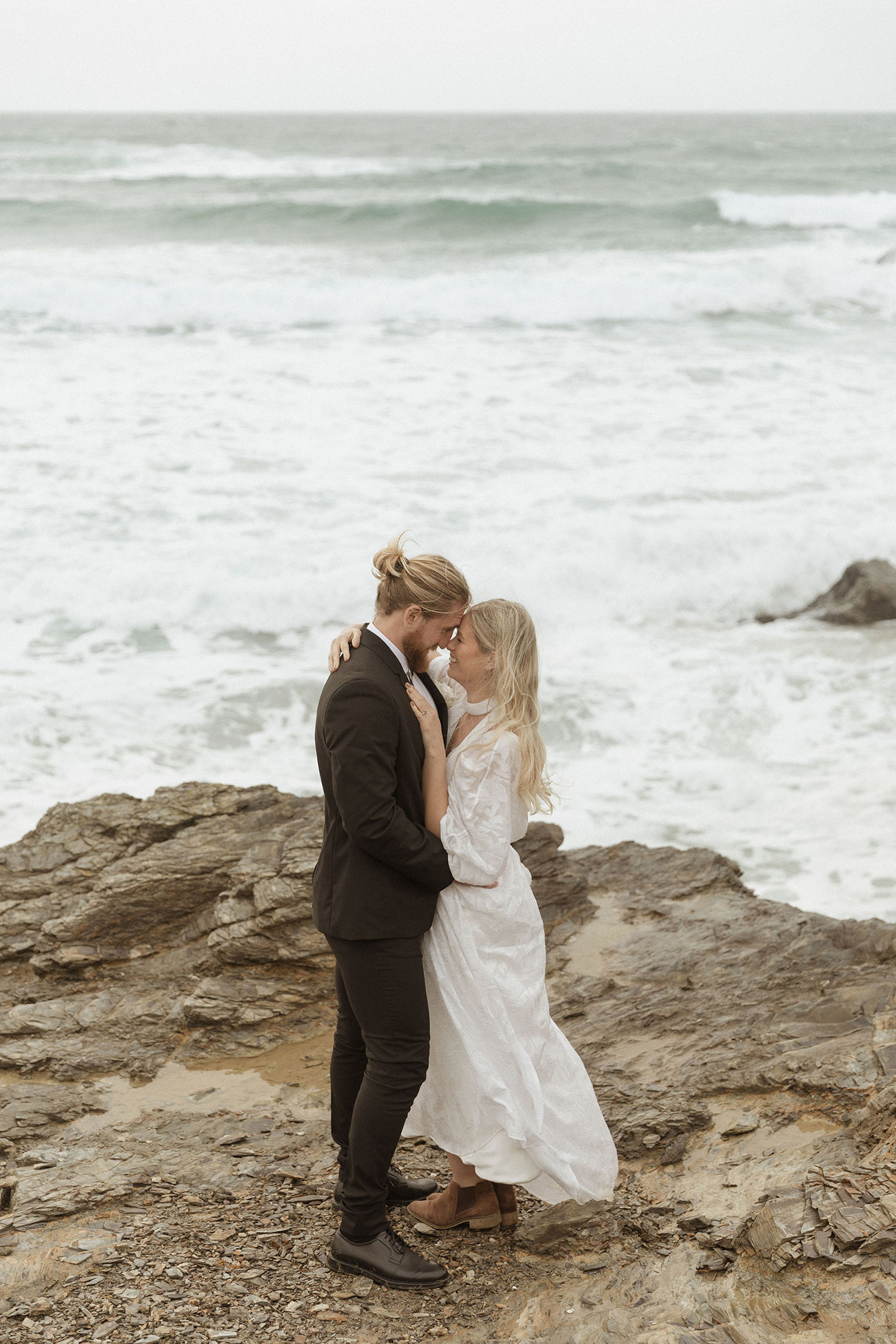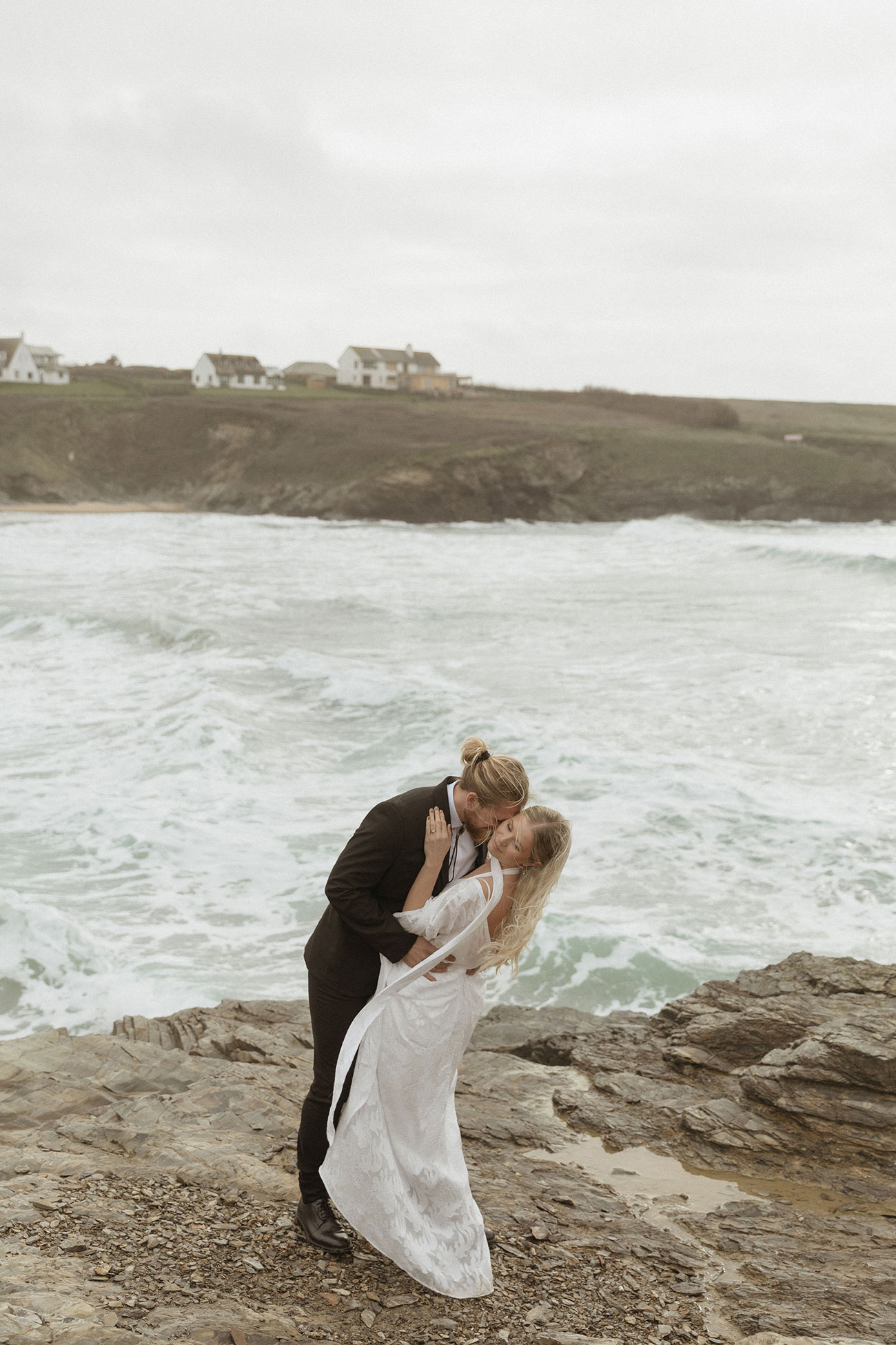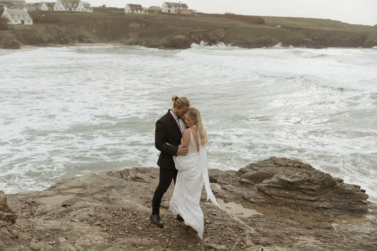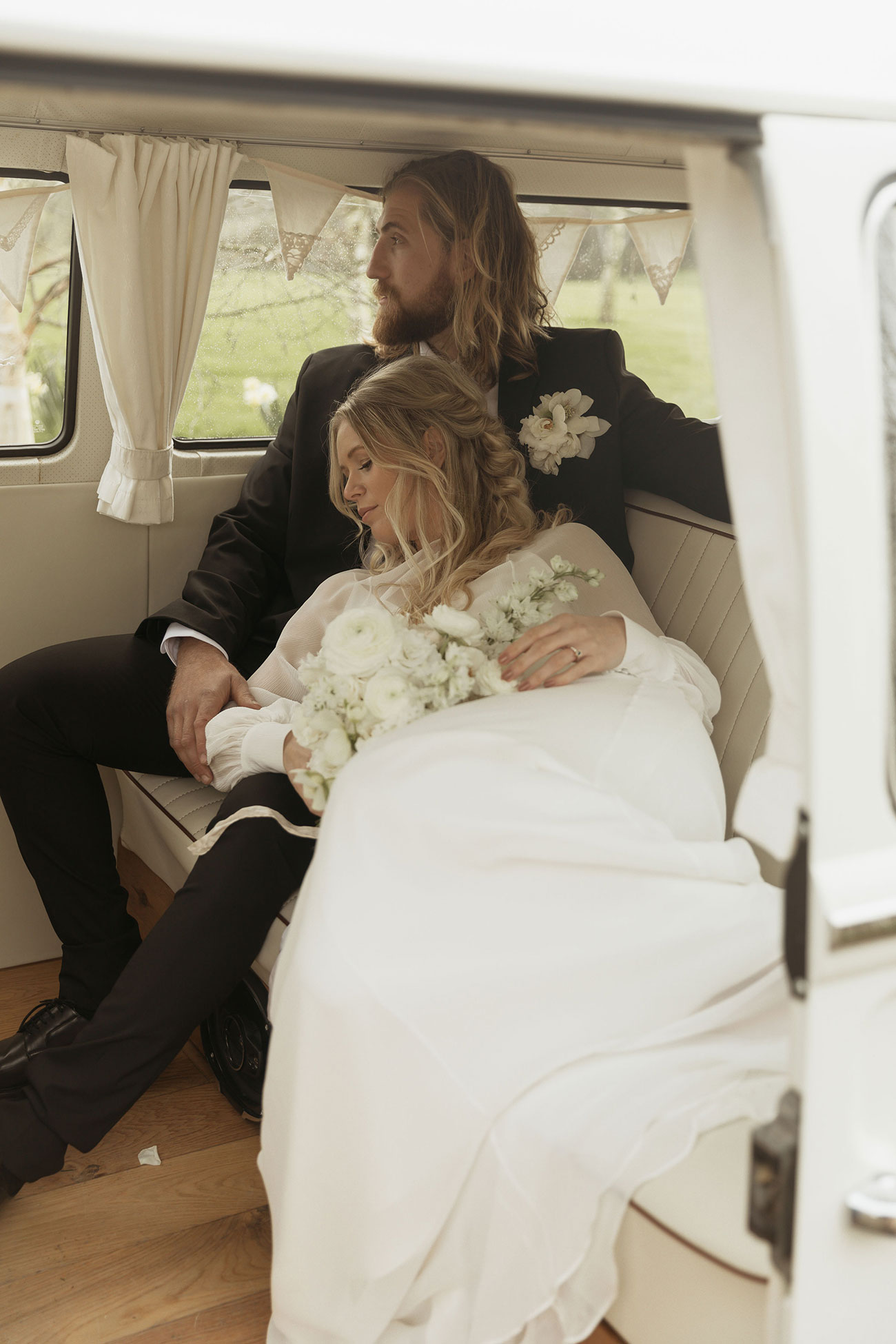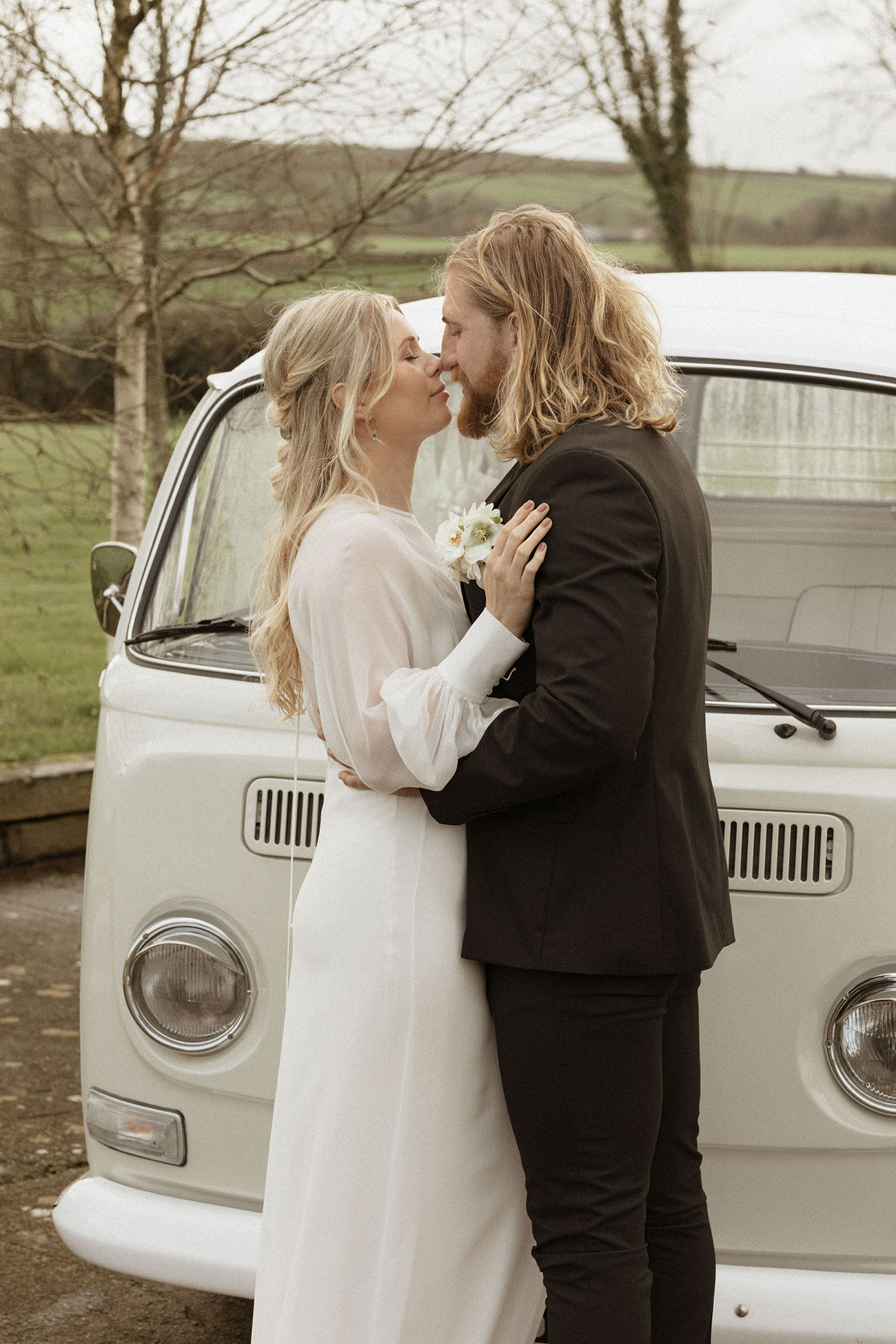 Heading off for the coast in a pearl white VW campervan, the Atlantic rollers tumble onto the shores as the newlyweds wrap their arms around each other with the wind in their hair and salt at their lips – embracing the wild romance of a wedding on the Cornish coast.
