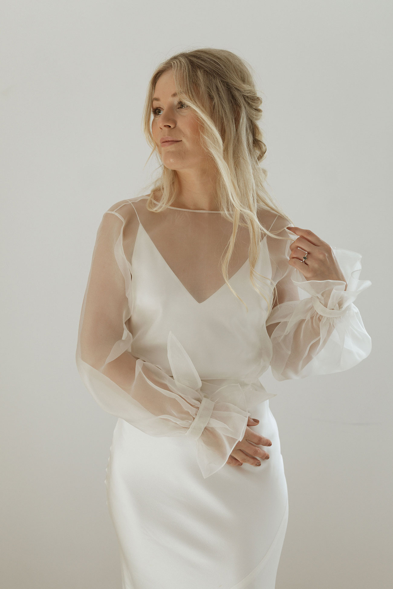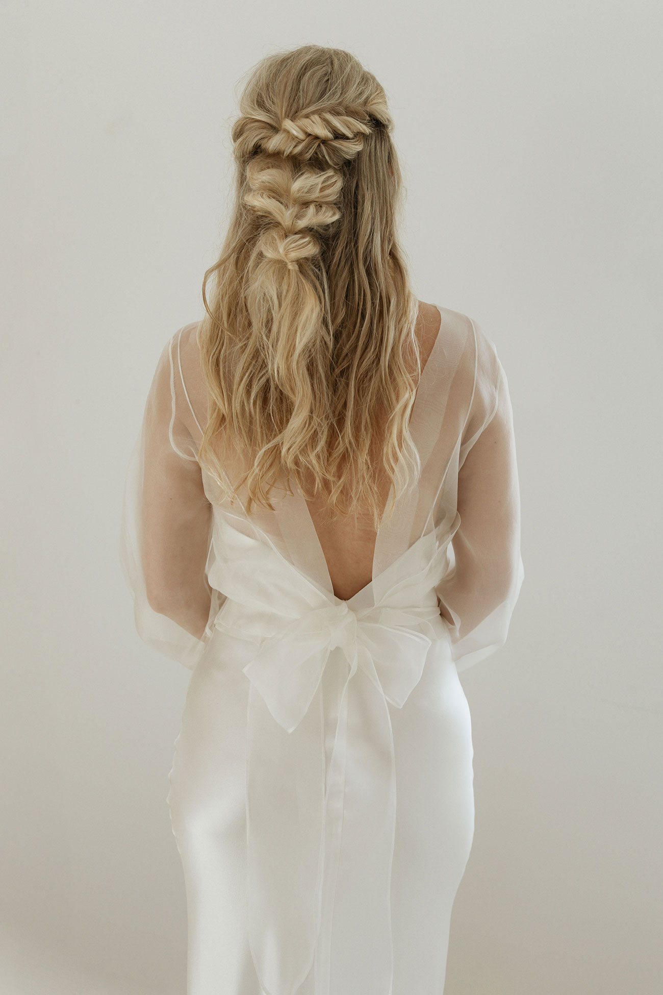 The bridal gowns blend the ethereal aesthetic with fashion-forward cuts, from an effortlessly romantic and softly draping silk devore gown to a sheer silk organza top layered over a minimalist slip dress. Shimmering make-up, a loose plait and tendrils of hair falling at the shoulders complete the serene look.