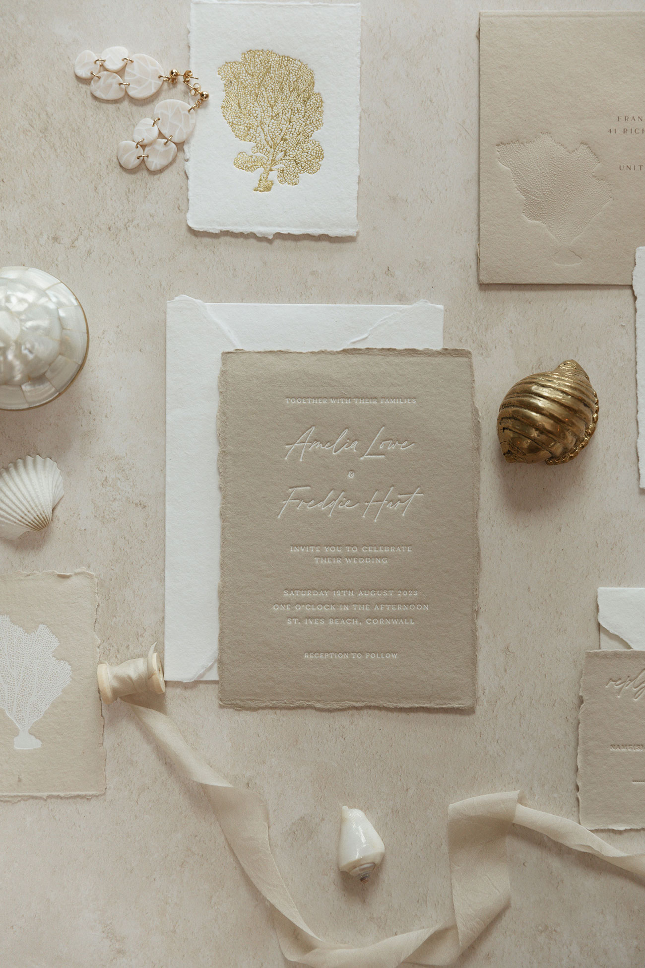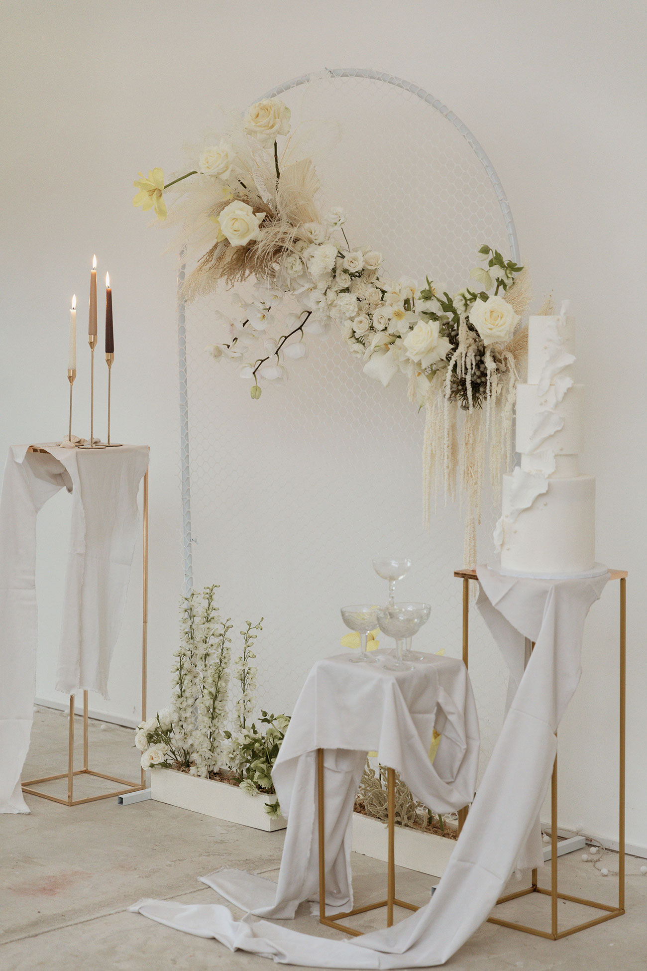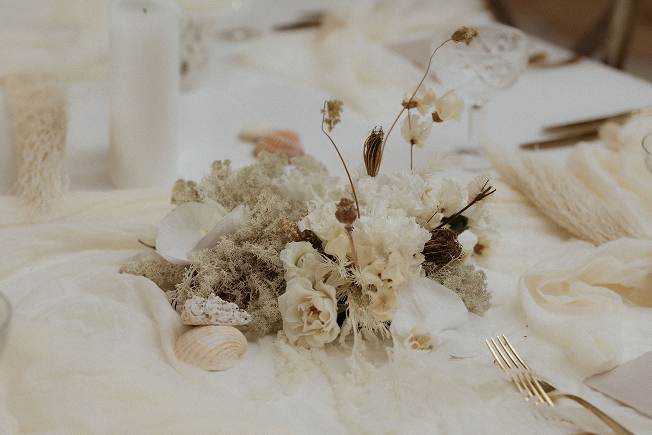 The blank canvas interiors of Camel Studio lend themselves to the muted hues and contemporary styling of the shoot. Soft textures and shades of pearly white, cream and taupe create a dreamy yet distinctly modern aesthetic which carries from the floral arrangements and stationery embellished with coral to the elegant white cake adorned with shell-like fragments and pearls. Creamy linens scattered with coral and shells add dimension to the tablescape, the ripples of fabric reminiscent of the sea, while gold cutlery and candlesticks adds a luxe accent.