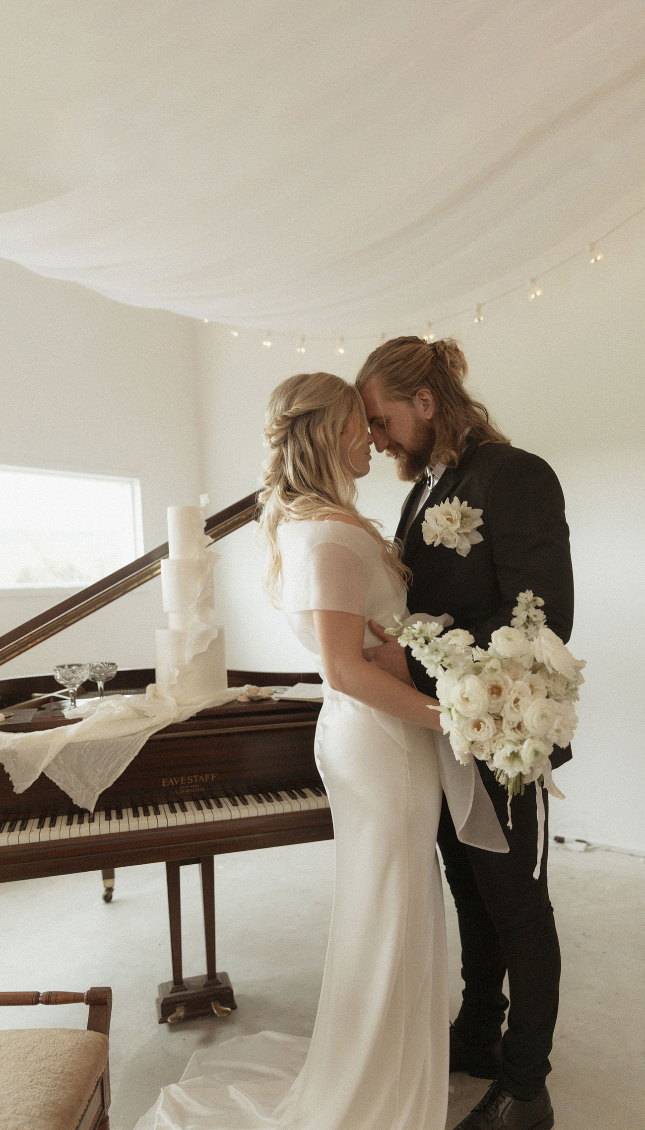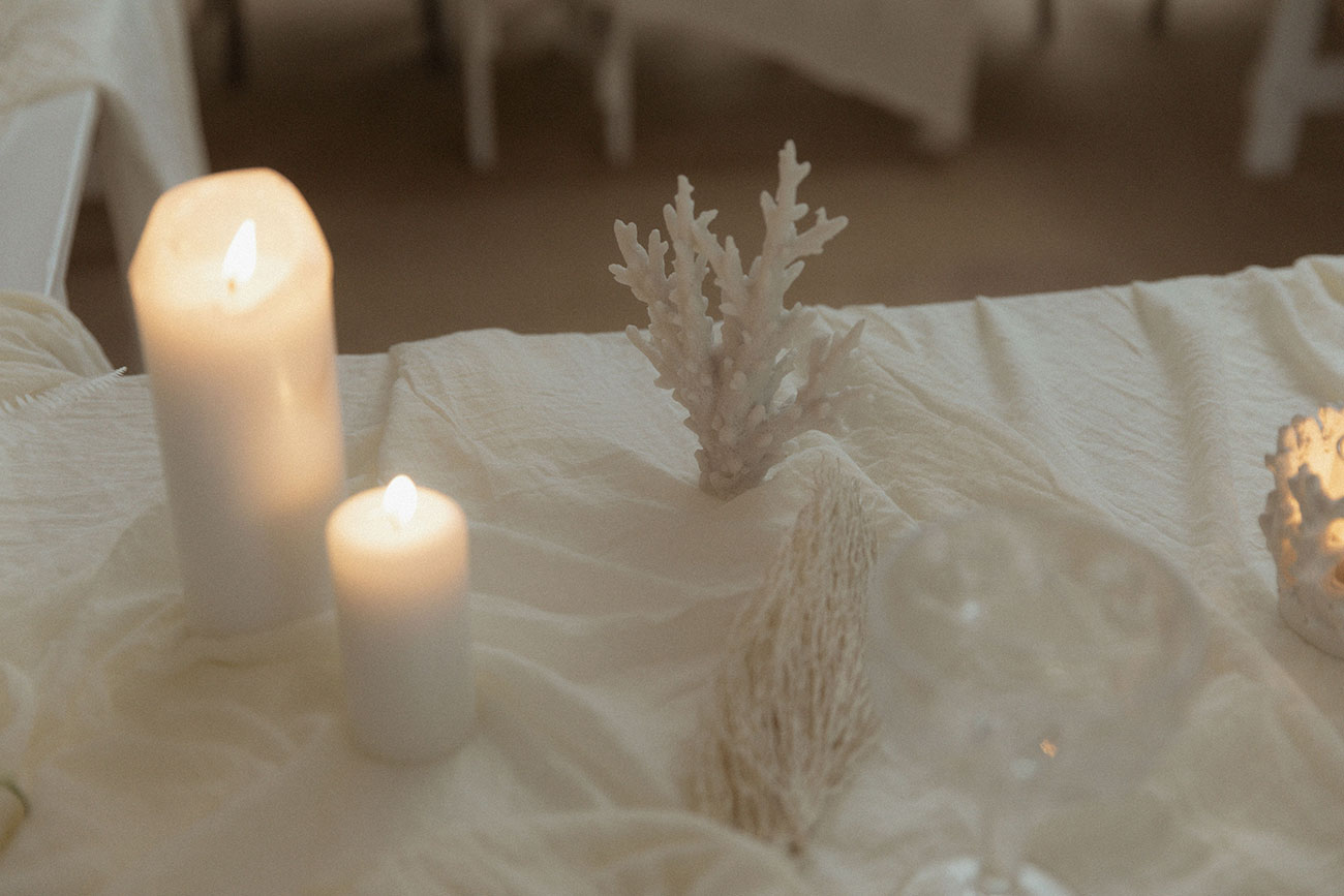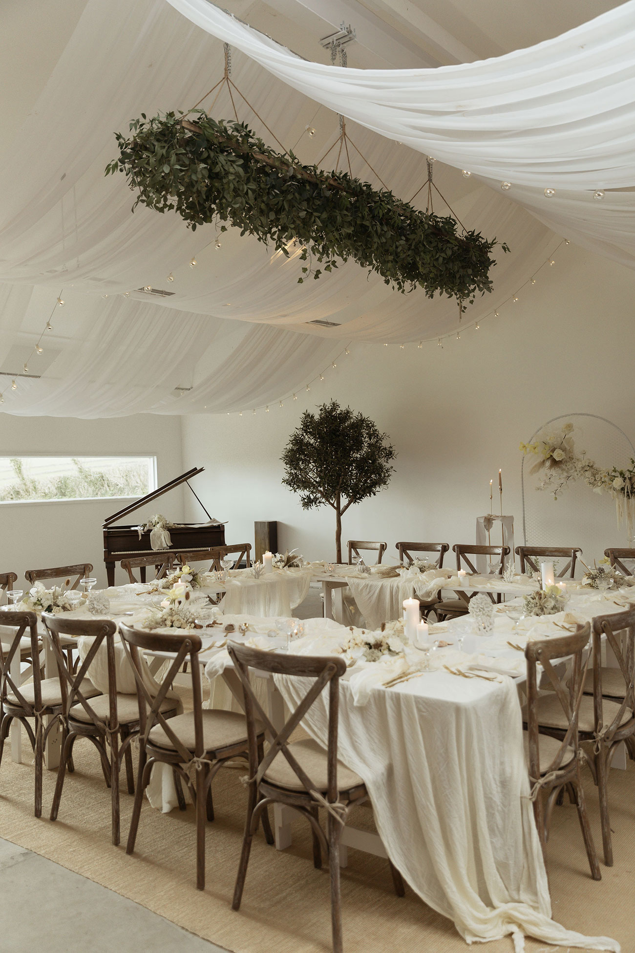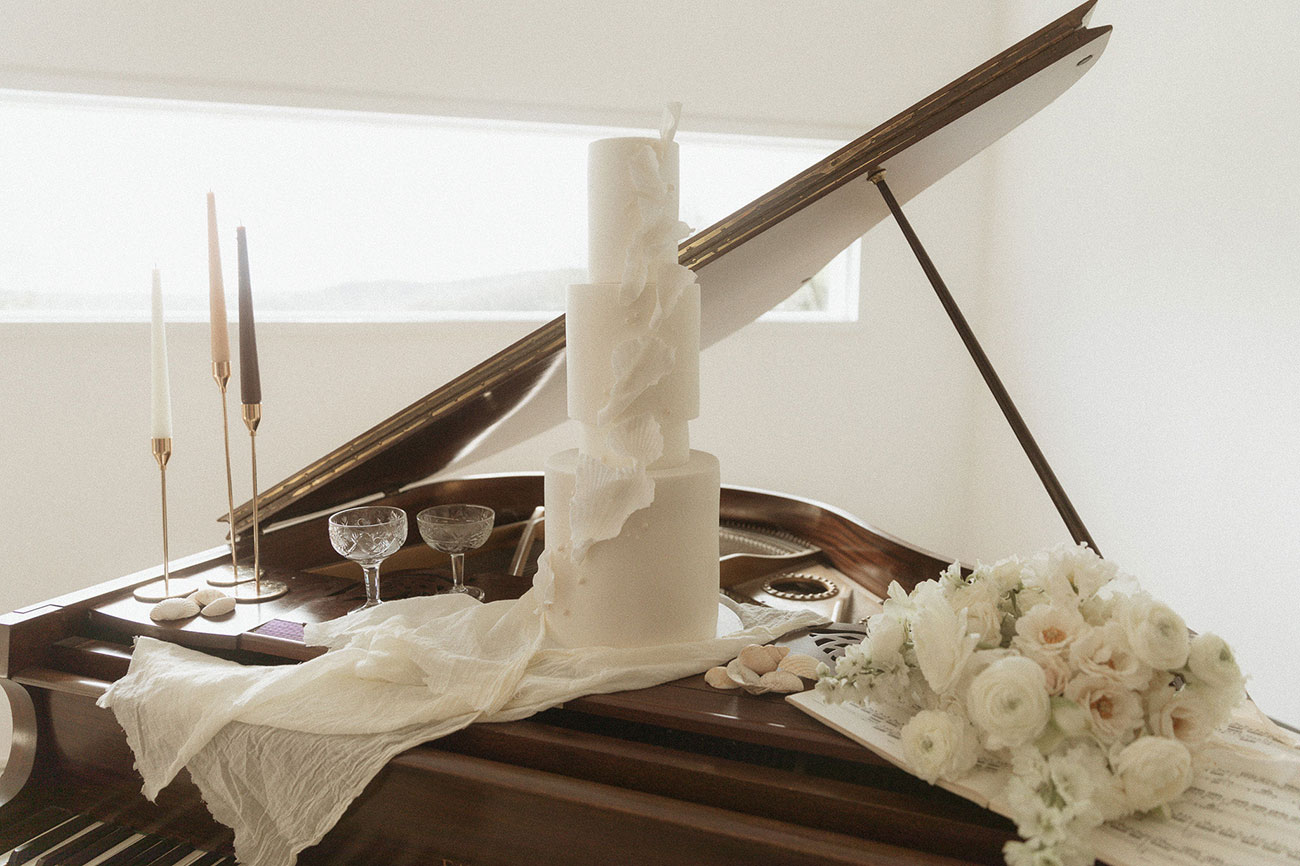 The blank canvas interiors of Camel Studio lend themselves to the muted hues and contemporary styling of the shoot. Soft textures and shades of pearly white, cream and taupe create a dreamy yet distinctly modern aesthetic which carries from the floral arrangements and stationery embellished with coral to the elegant white cake adorned with shell-like fragments and pearls. Creamy linens scattered with coral and shells add dimension to the tablescape, the ripples of fabric reminiscent of the sea, while gold cutlery and candlesticks adds a luxe accent.