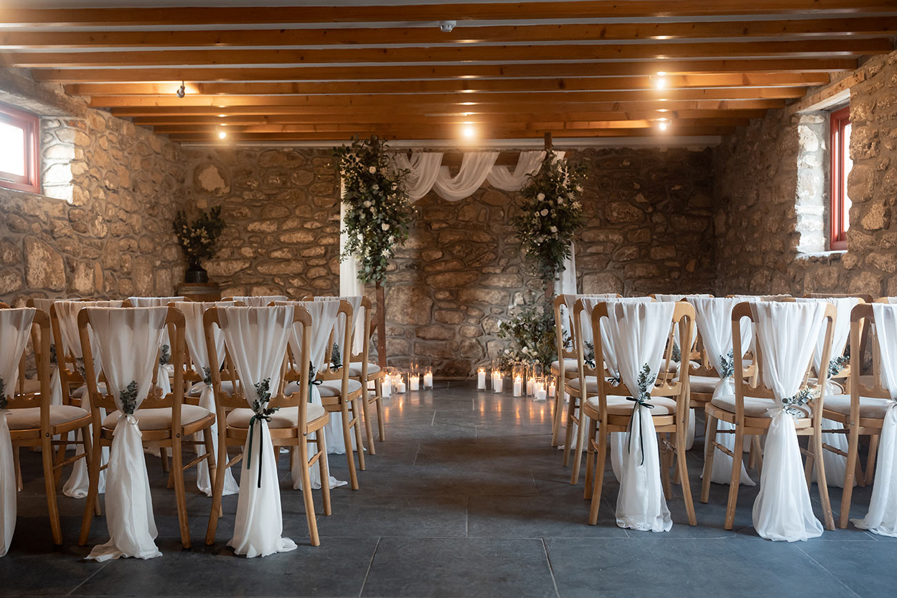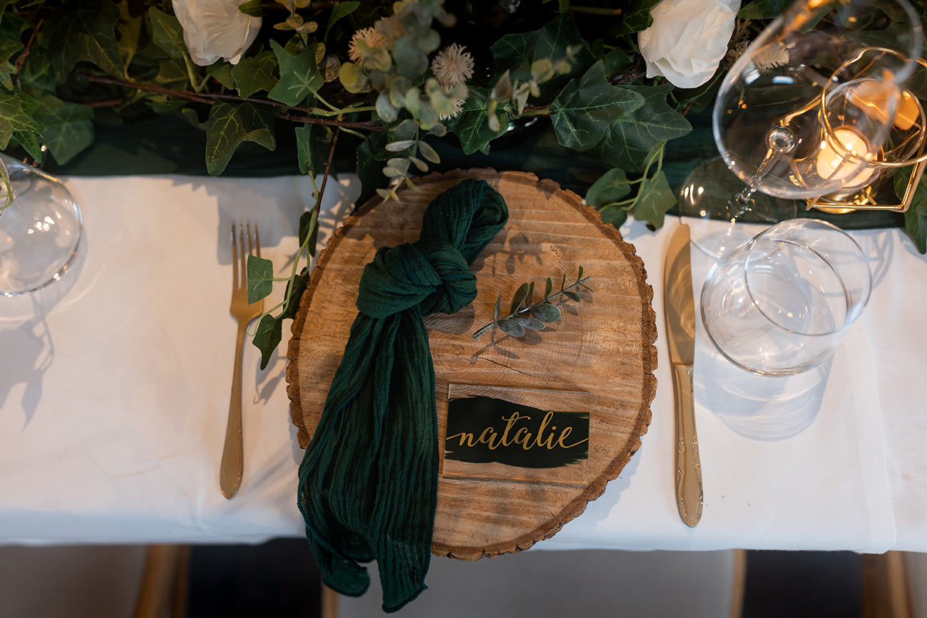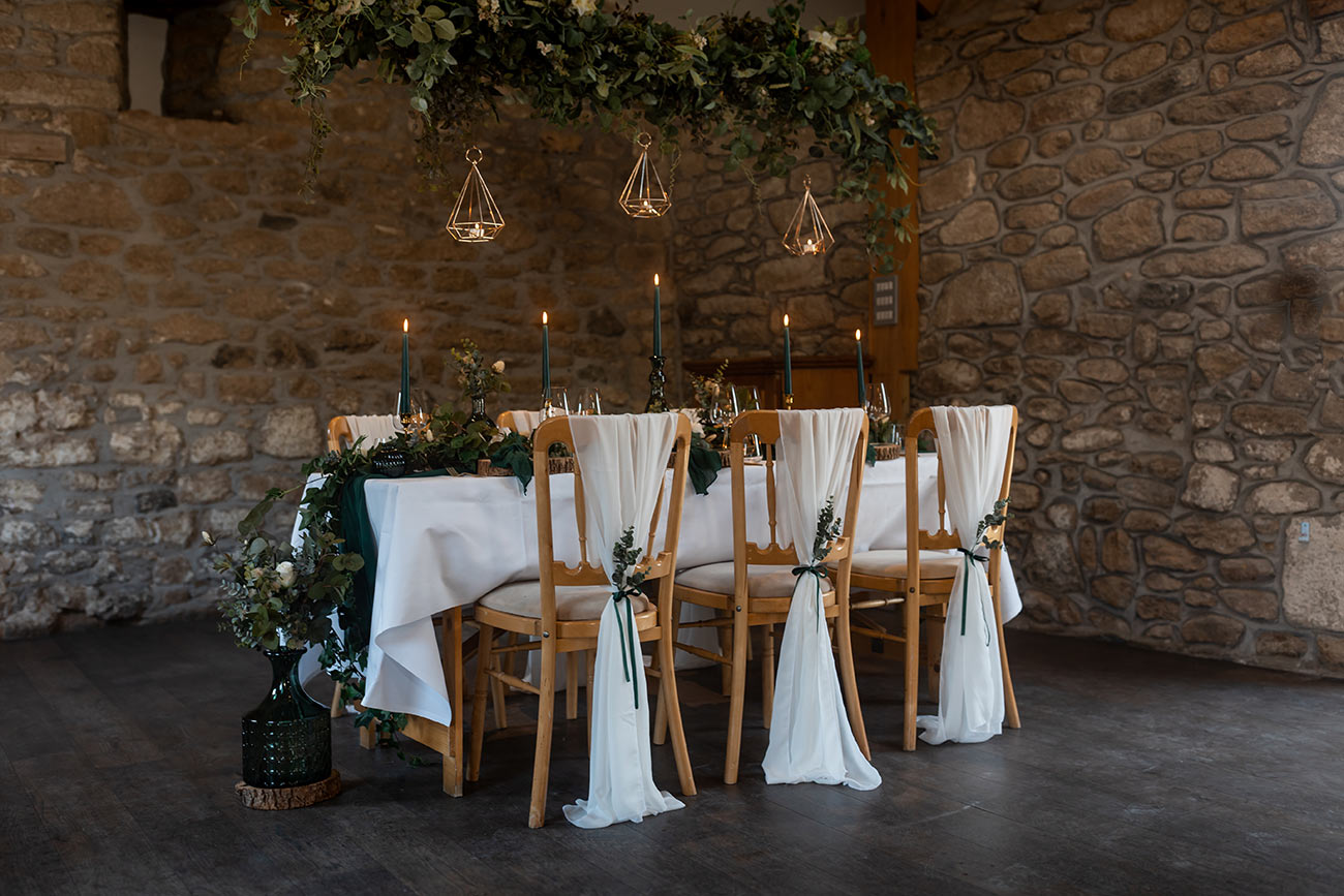Complemented by a bounty of foliage dotted with cream blooms, the colour scheme of teal, forest green and gold makes for a striking scene against the Cornish granite walls of the 18th century barn. Flora and foliage carry from the tablescape and ceremony arch to the detailing on the stationery, while bold blooms in shades of plum and dusky rose look stunning against the textured teal and gold cake. The gold accents of the cutlery, candlesticks and candleholders add elegance, elevating the tablescape, while cut log place settings and sprigs of eucalyptus enhance the nature-inspired feel.