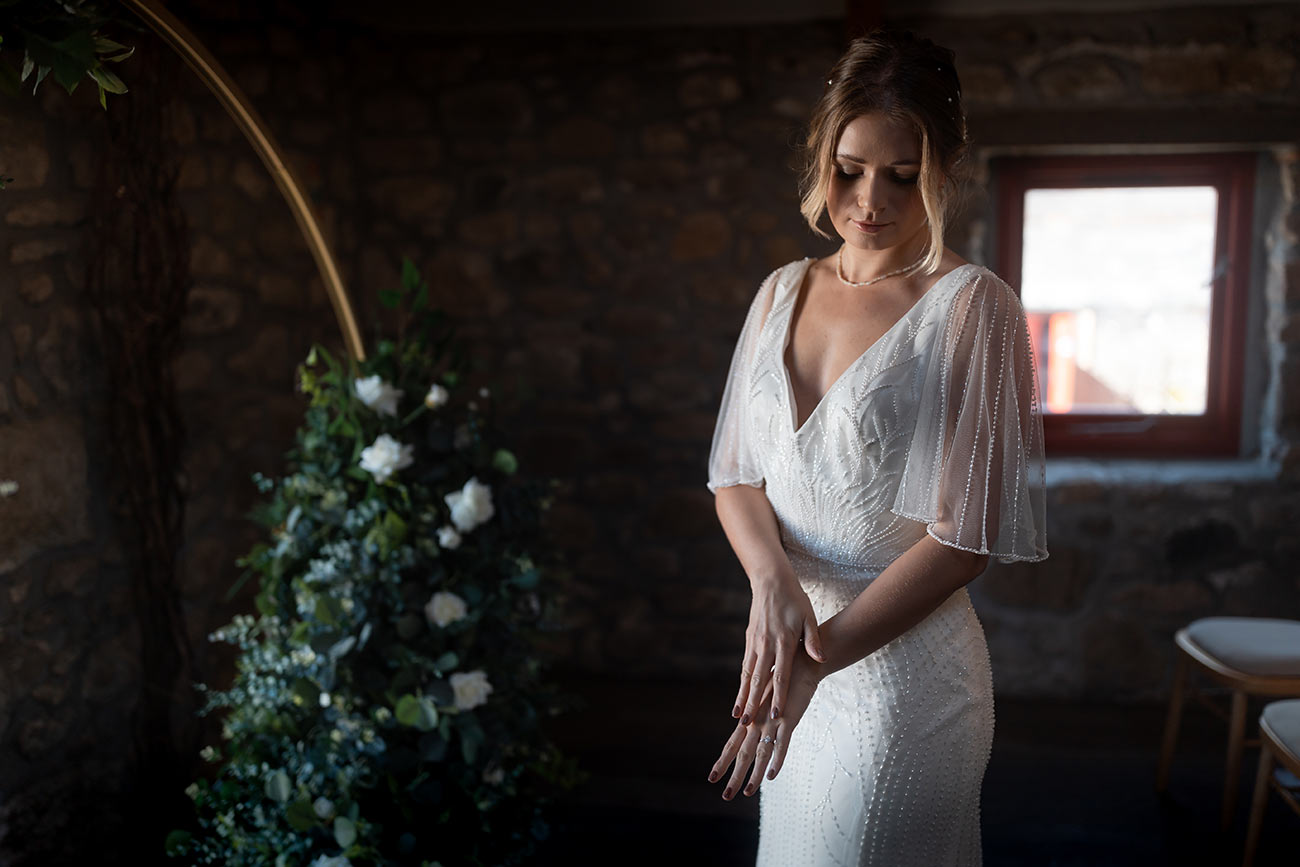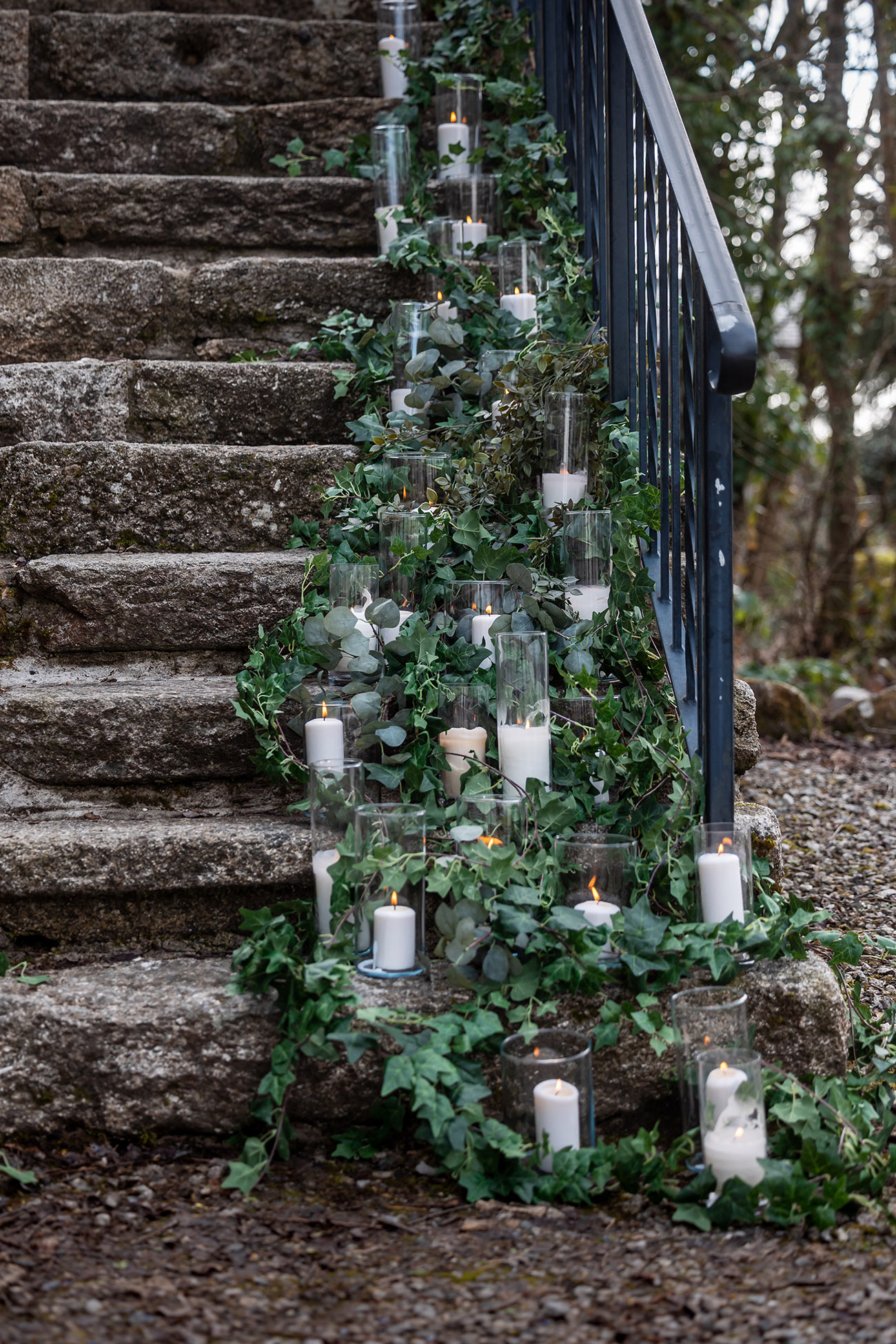 Outside amidst the wooded grounds, the dappled light glints on the intricate beading of the bride’s gown, shimmering on her dainty jewels and hair pearls, adding magic to the captivating winter scene in this secluded corner of Cornwall.