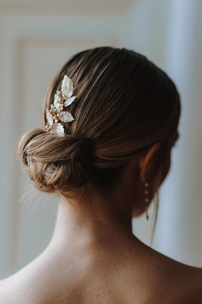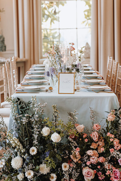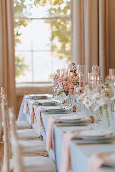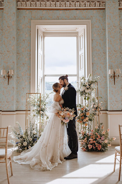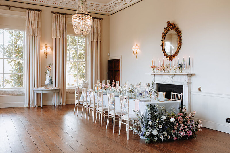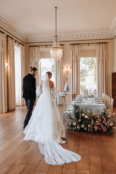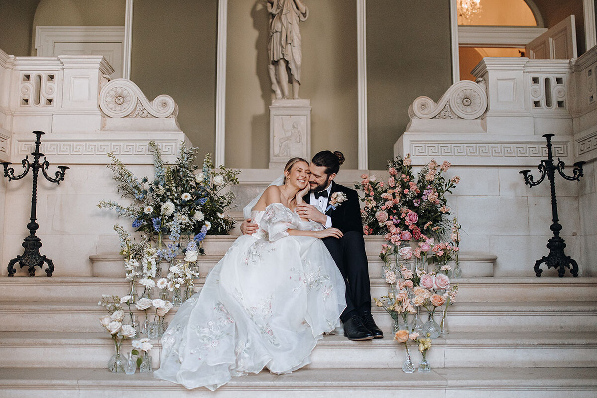 In the stately reception room, delicate white china sits atop silken peach napkins framed by gold flatware and crystal glassware, while centrepieces of miniature posies are flanked by tall tapered glass candleholders. The period features of Pynes House extend the timelessly chic feel through ornate mirrors, eye-catching chandeliers, antique furniture and the statement marble staircase – the perfect place for the couple to pose for breathtaking bloom-filled photos.