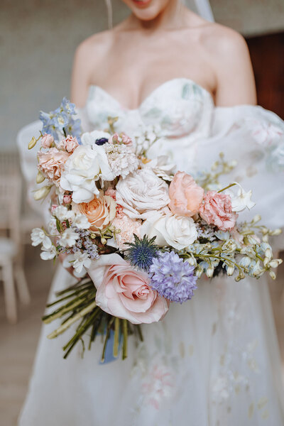 Soft pastel shades set the scene of elegance and are carried in everything from the floristry and stationery to the tablescapes and bridalwear. The ceremony space is bursting with natural light, blousy blooms adorning the arch and carried by the bride who wears a gorgeous off-the-shoulder puff-sleeve corset gown embellished with a beautiful botanical print. The cake is a vision of decadence: a textured four-tiered ‘living’ creation crowned by a cluster of fresh apricot roses reminiscent of an oil painting.