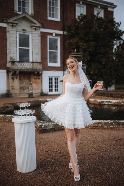 Outside, a champagne tower pre-empts the party mood, allowing the couple a private al fresco toast in front of the house, ahead of the group celebrations. His debonair tux is perfectly on-trend yet timeless, while her dress change into a short, tiered frock makes for a fun and flamboyant dance-ready confection. The couple transition from day to night, from betrothed to newlyweds.