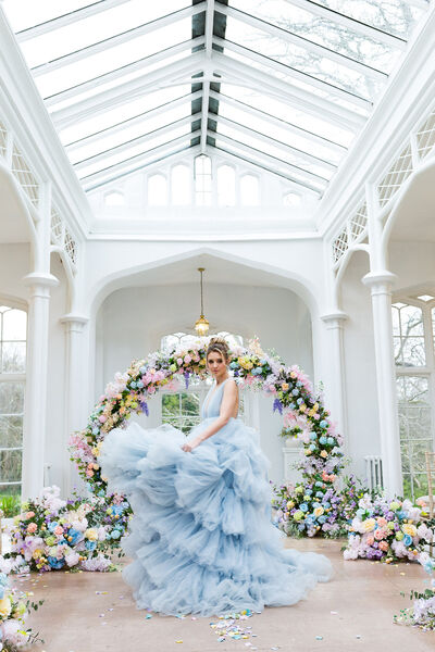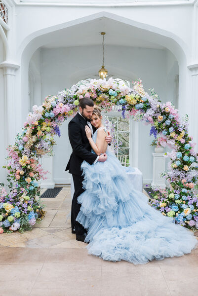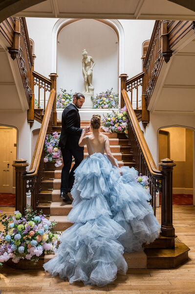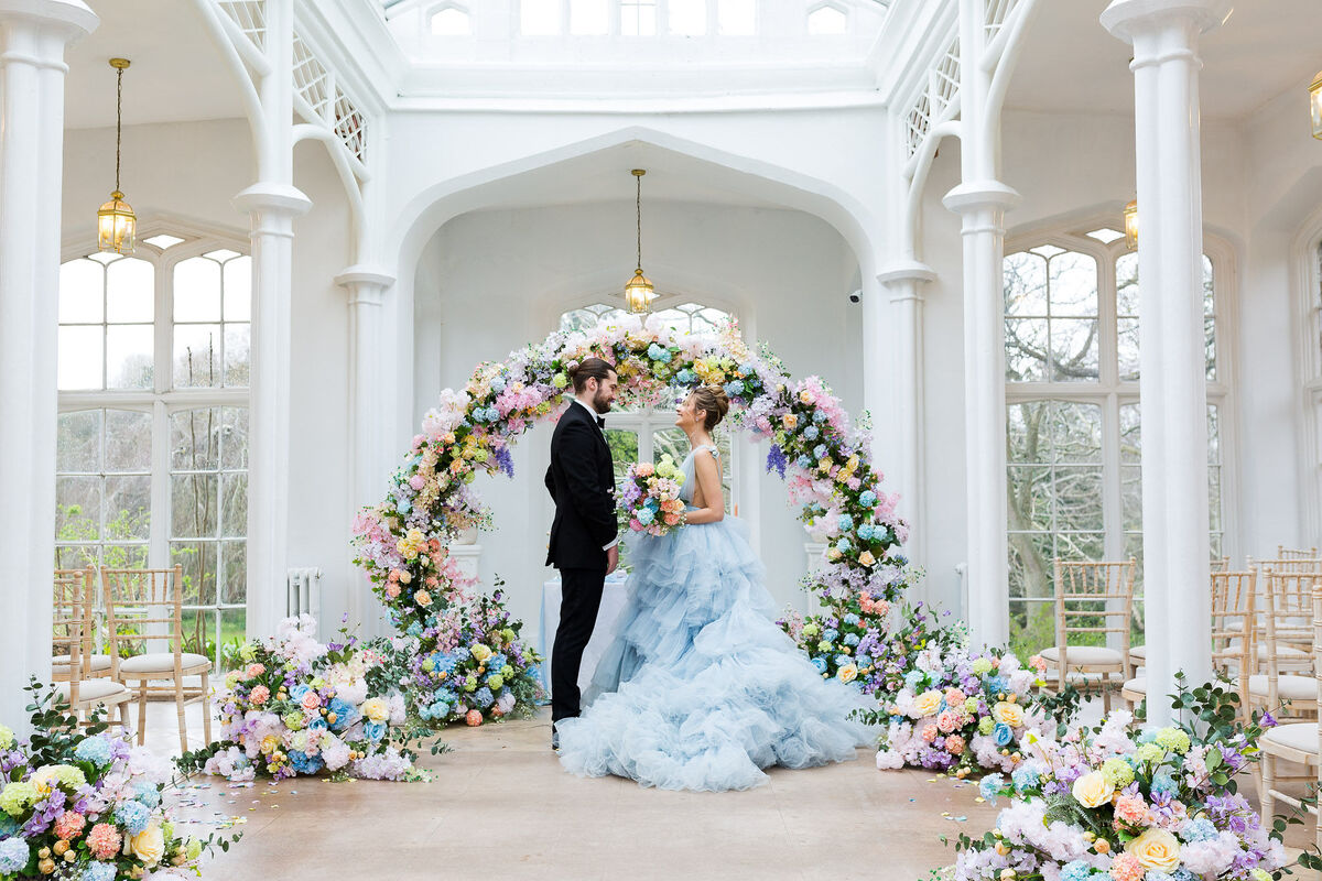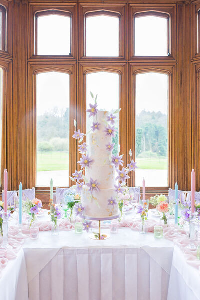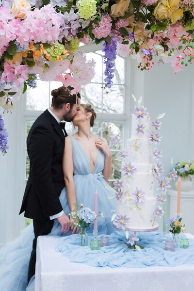 The Victorian Orangery brings the drama with its golden aisle and towering floor-to-ceiling windows, while a statement floral arch and smattering of floor arrangements draw the gaze along and toward the end of the aisle, the surrounding parkland providing a lush green canvas from every view beyond. In the Banqueting Hall overlooking the rose garden and deer park, trestle tables adorned with baby pink chiffon runners, colourful glassware and candles, and a rainbow of blooms create an air of romantic sophistication. This is mirrored by the cake: a four-tiered extravaganza featuring seasonal sugar clematis flowers alongside intricate baby blue, iridescent pearl, gold leaf and floral detailing.