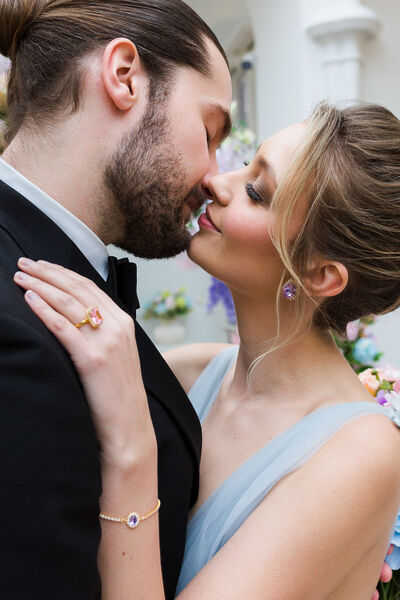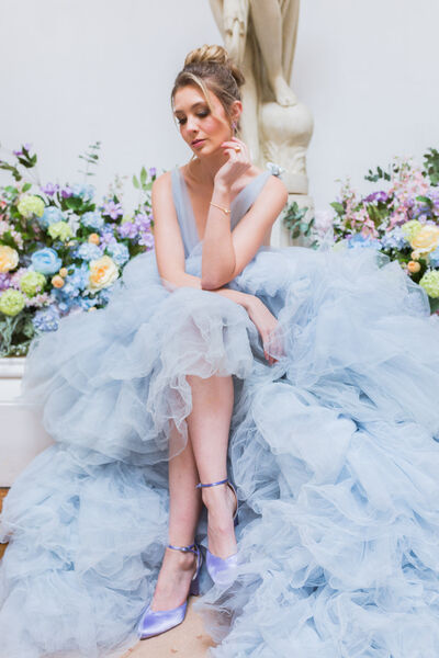 The dress – a pale blue confection of voluminous ruffled tulle – oozes wow-worthy seduction and is contemporised with a deep plunging neckline, delicate spaghetti back straps and 3D silk blossom petals. Not to be sartorially outdone by his bride, the groom is the picture of princely chic in timelessly tailored black tie. A fairytale vision brought to life.