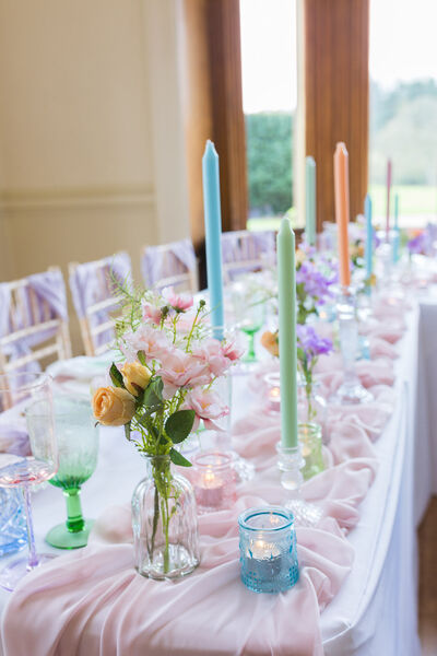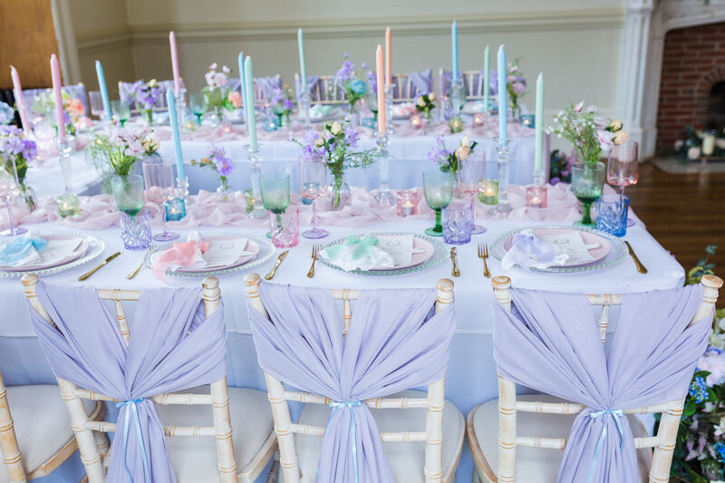 The epitome of country grandeur with a heady twist of glamour, St Audries Park – situated at the foot of the Quantock Hills – is the perfectly picturesque backdrop for this beautifully whimsical styled shoot. A palette of pastel pink, lilac, peach and blue blend with soft textures to create an uber-romantic look and atmosphere in the country manor house with its light-filled spaces and fabulous period features.