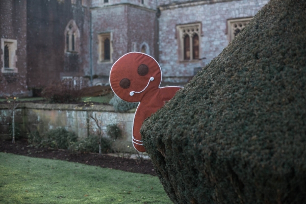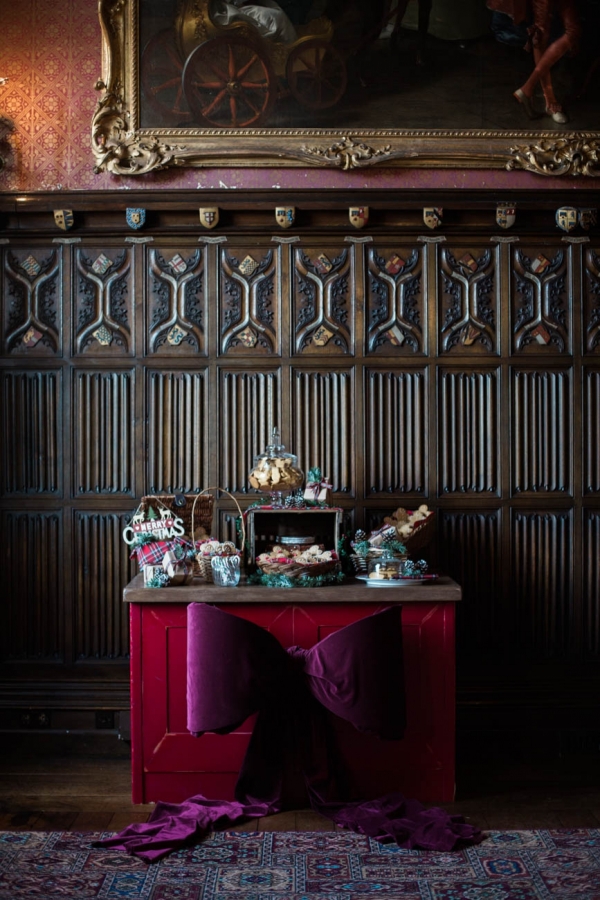 Using Powderham Castle as the cosy backdrop, a giant bow immediately brings the feeling of the festive season to life, with a rustic table piled high with Christmas goodies. Piles of fir cones and holly vines weave throw the tablescape, while candy canes and presents galore stand out among sprigs of pine and laser-cut wooden signs depicting reindeer and Christmas trees.