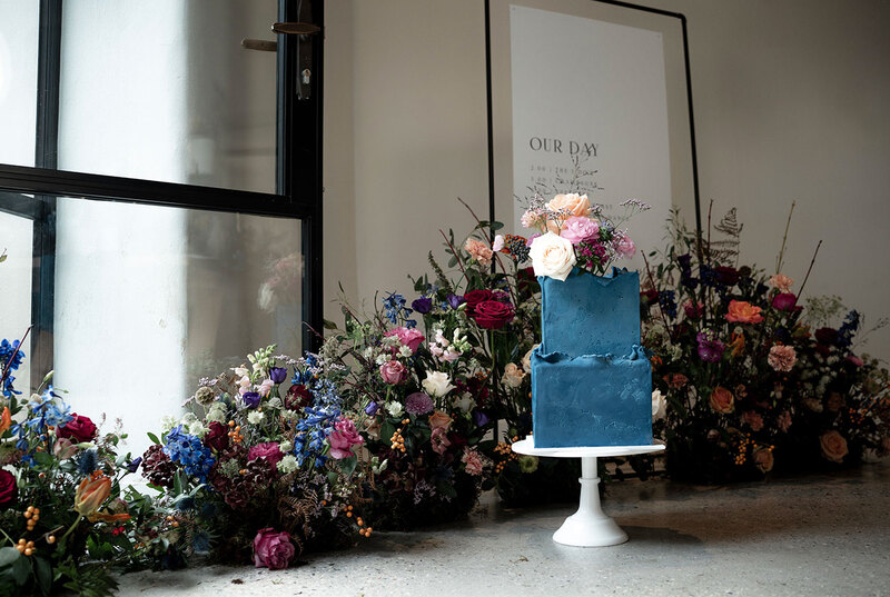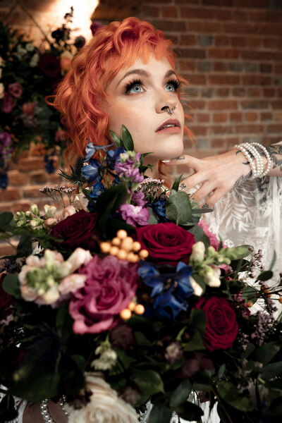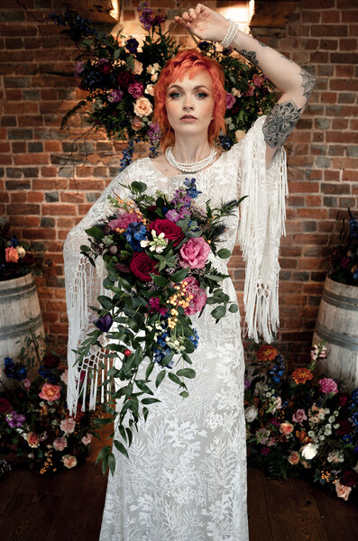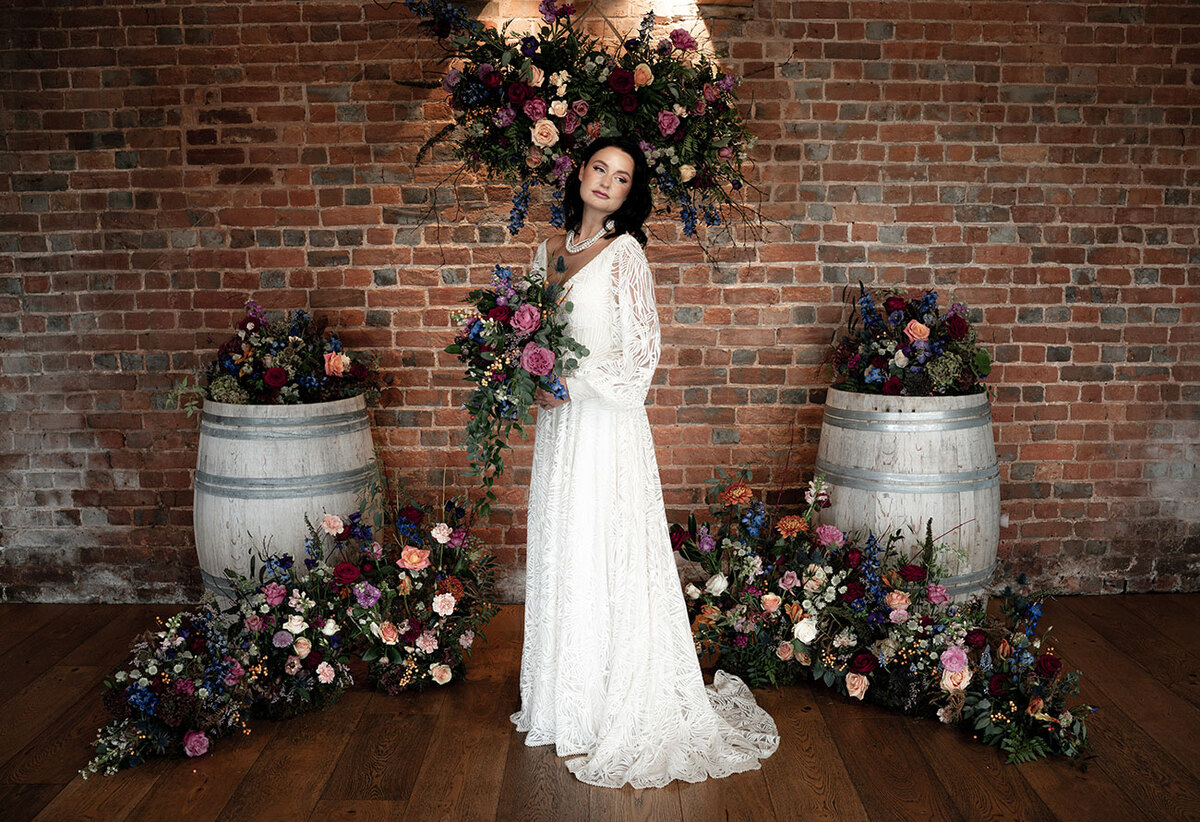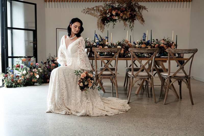 Elegant blooms take centre stage in this eye-catching styled shoot, with their myriad forms including a floral chandelier, statement hanging installations, centrepieces, a floral arch and oversized vases dotted throughout Brickhouse Vineyard in earthy shades spliced with jewel tones.