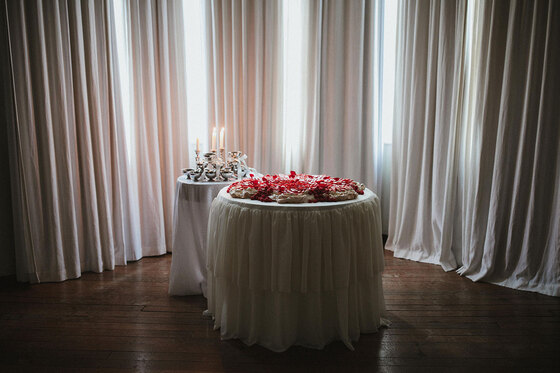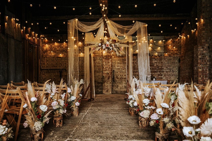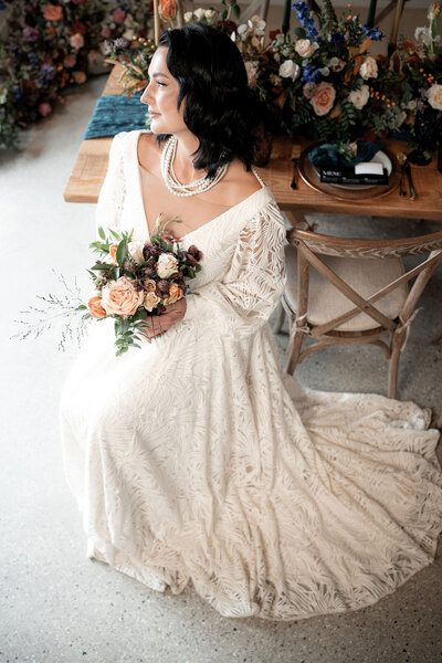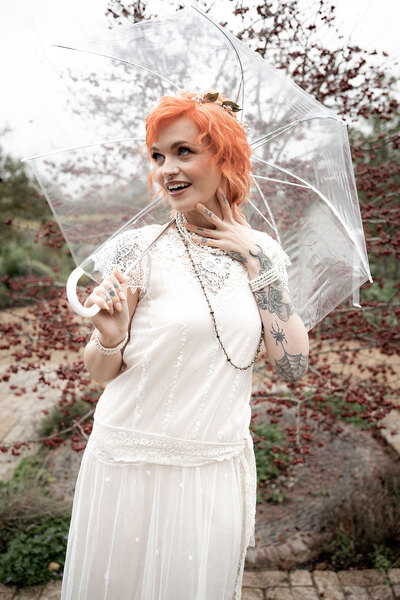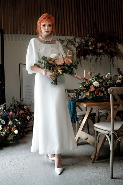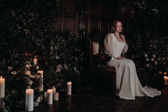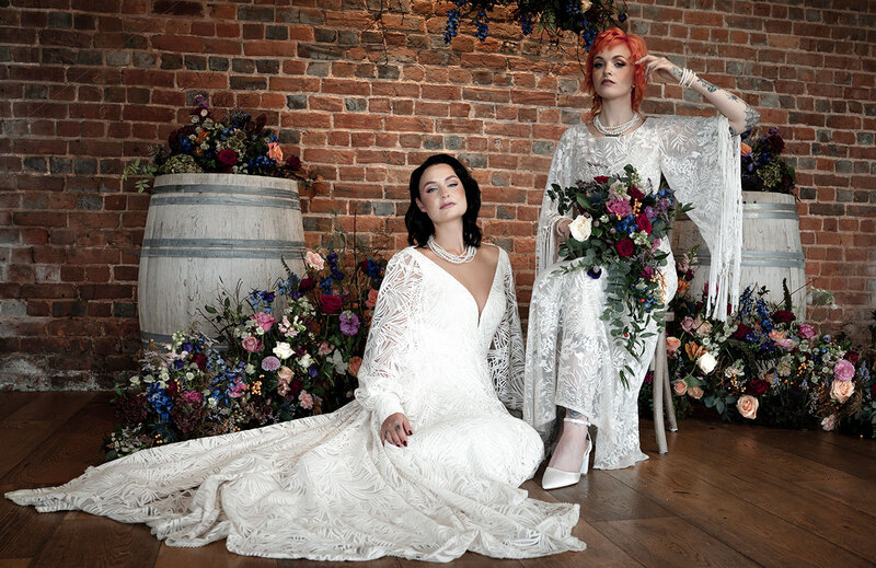 The bridal gowns play a pivotal role in achieving the vibe, with six looks showcased to explore the shoot’s sartorial keynotes from Days of Grace Vintage in Budleigh Salterton and Devon-based designer, Dandelions and Pearls. There’s a classic long-sleeved geometric lace gown, a cap-sleeved vintage shift with lace accents and exquisite art deco style embroidery, a botanical lace and fringed dress, a puff-sleeved minimalist A-line and a chic high-collared number. The pièce de résistance is a muted gold flapper frock bedecked with sequins and metallic embroidery, as attention-grabbing as it is coolly in keeping with the bygone sense of opulence. Ornate floral fascinators and strings of pearls provide the perfect final flourishes while tying together the overarching vintage look.