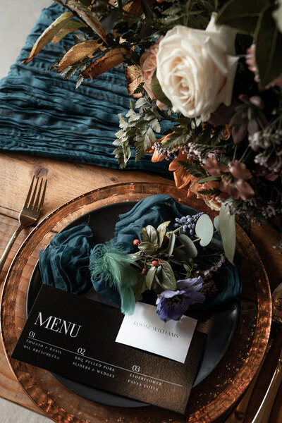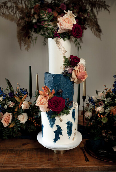 When it comes to the décor, decadent cakes adorned with fresh blooms and botanical motifs, and monochromatic stationery complement the elegant table settings. Here, gold charger plates and flatware, small posies in miniature glass vases and colourful tapered candlesticks create both inviting warmth and an eclectic edge.