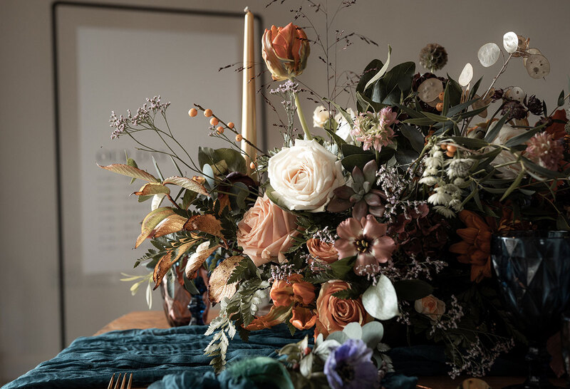 This so-pretty palette of deep green, russet red and nut brown fuses with pastel peach, rich lilac and sorbet pink to create a seductively timeless look layered with interest while evoking the untamed beauty of nature. Adding a touch of vintage luxe through the 1920s-inspired detailing, the shoot is the result of a creative collaboration between florist Alice Wright at From The Wild and her students. “The end brief was an alternative, opulent 1920s vibe meets woodland magic – and a festival of colour and glamour commenced!” she says.