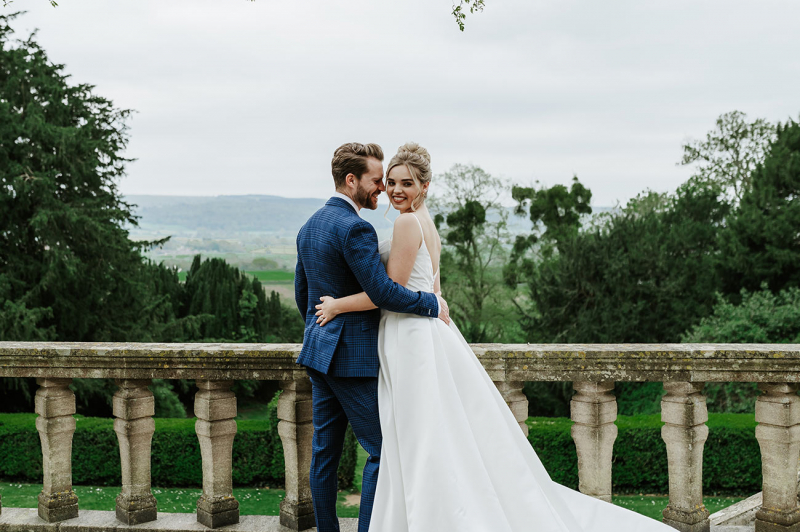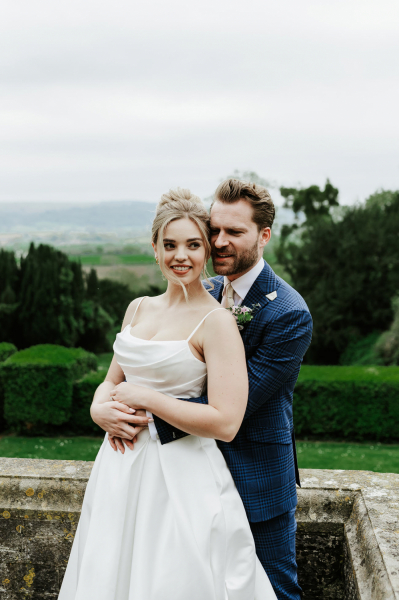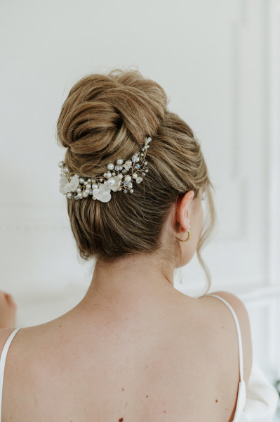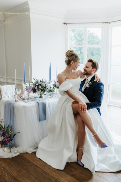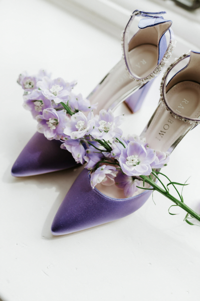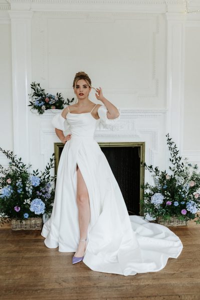 The perfect pairing for the dreamy details, the bride stuns in a stylish A-line gown with a high leg split and removable off-the-shoulder puff sleeves. Her glamorous updo is finished with a bespoke floral hair accessory, while a soft natural pink lip enhances the mood of romance. A pair of lilac heels make the oh-so gorgeous finishing touch to the pastel-pretty scene.