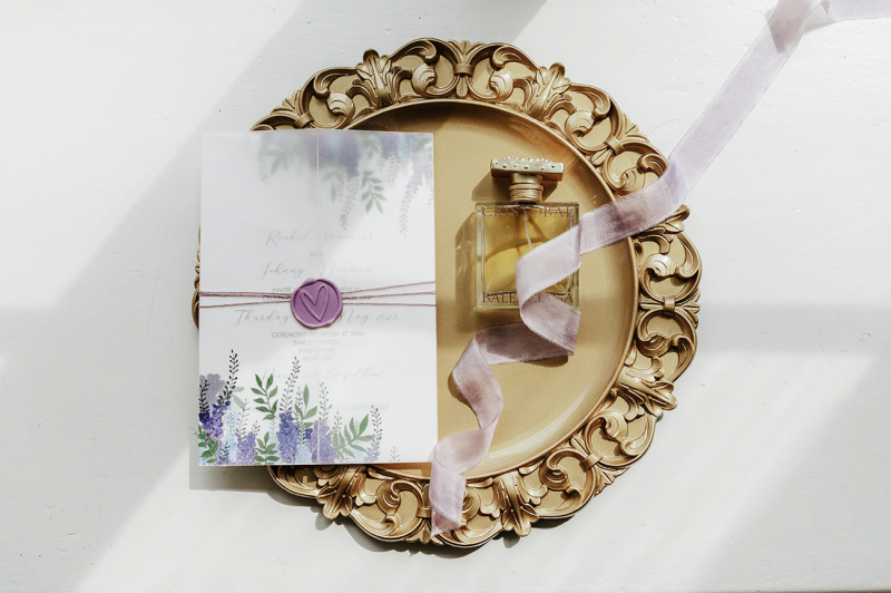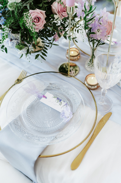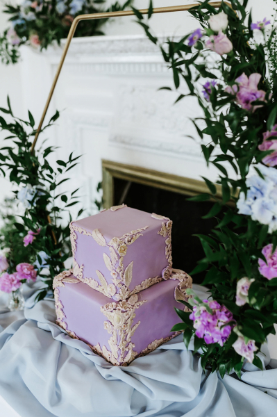 Pale blue silk table runners and napkins teamed with gold accents make the table details pop against the fresh white backdrop of the neutral venue, while gold-rimmed glass plate chargers are topped with pretty place name cards, finished with lilac ribbons. The luxe air of romance continues in the stationery suite, with a lilac, pale blue and purple wisteria design trailing across the textured card, and the two-tiered lilac cake with its painted gold sugar work and a decorative floral arch framing it.