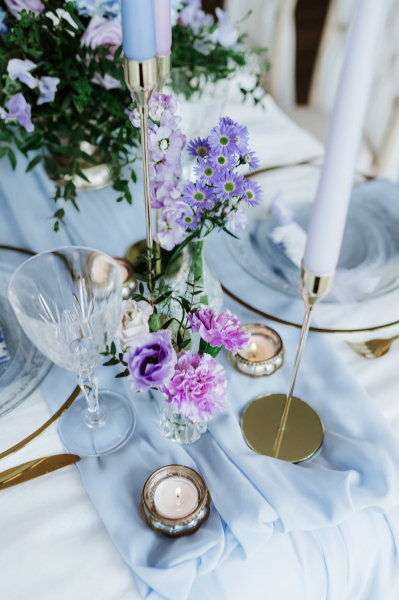 A powder blue French Renaissance theme evokes a classic, elegant and dreamily timeless feel. Floral displays filled with pale blue hydrangea, scented sweet peas, soft lavender roses, delphiniums and stocks are paired with fragrant foliage, in the form of eucalyptus and ivy, to give the blooms a gathered-from-the-garden feel.