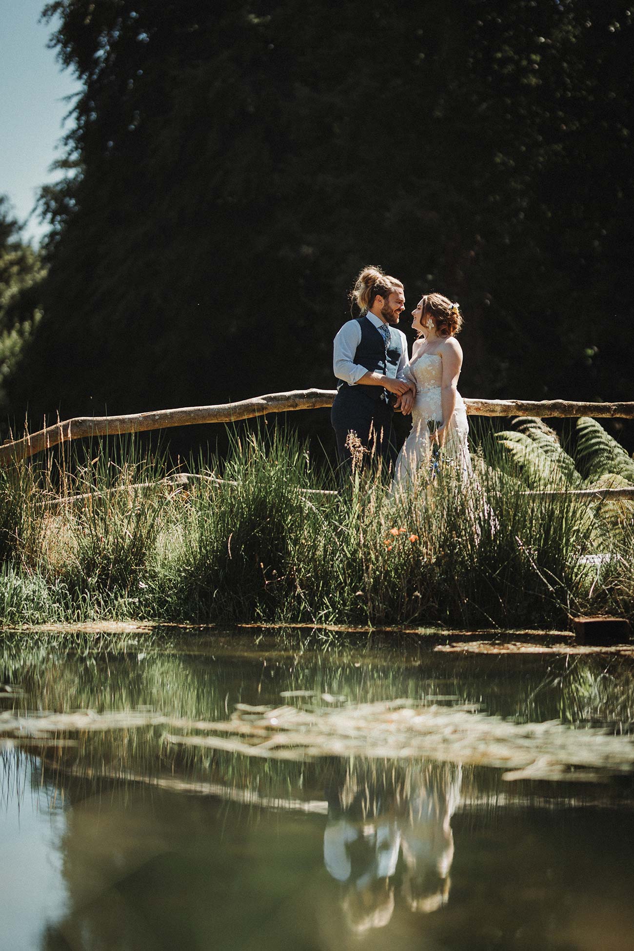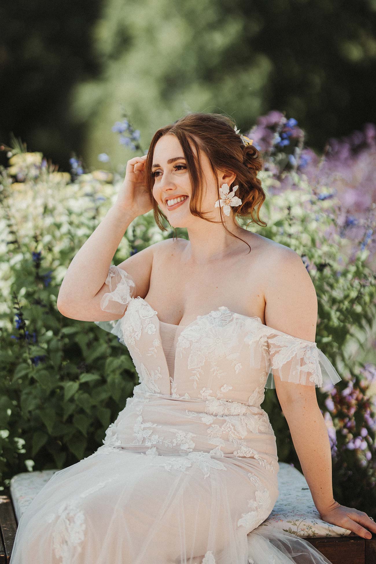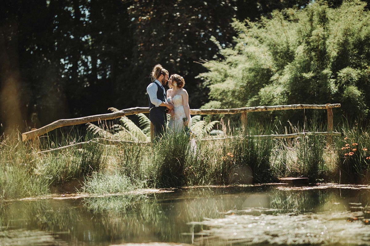 The bride and groom are the epitome of sweet summer love. From the floral accents of the groom’s ensemble to the bloom-filled embellishment of the bridal gown and earrings, the couple carry the romance of the garden setting as they take a loved-up stroll through the sun-kissed gardens of this captivating country idyll.