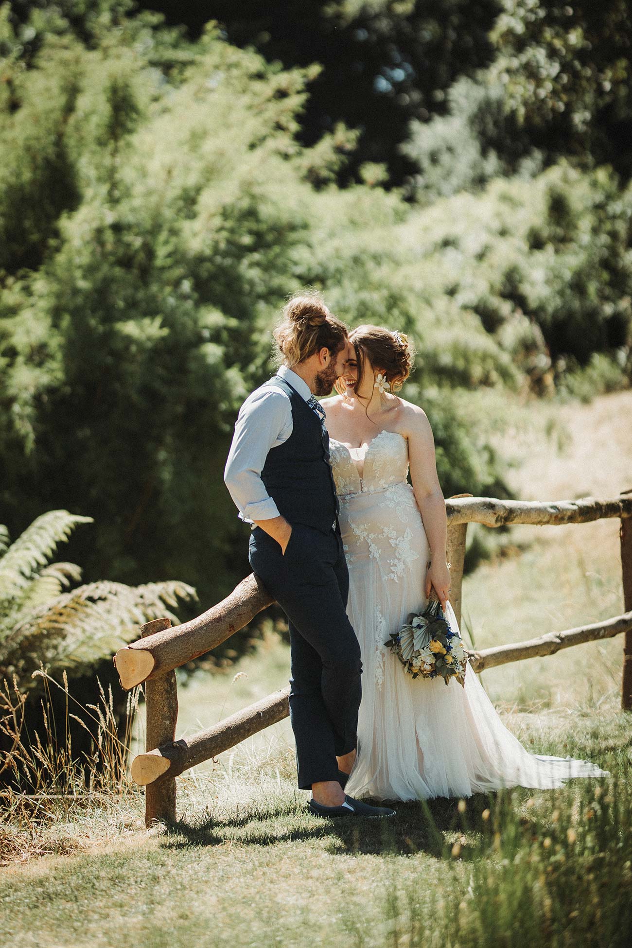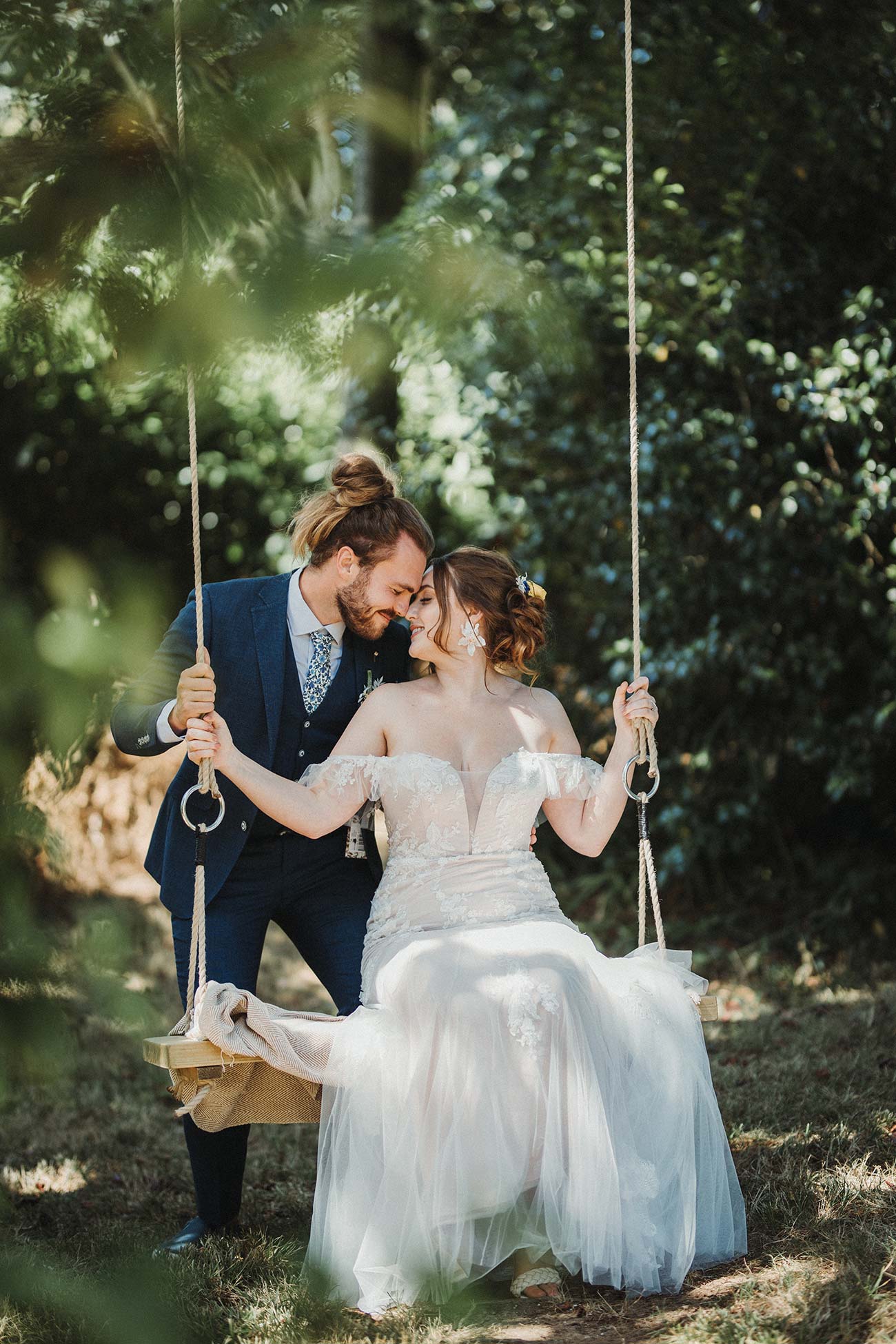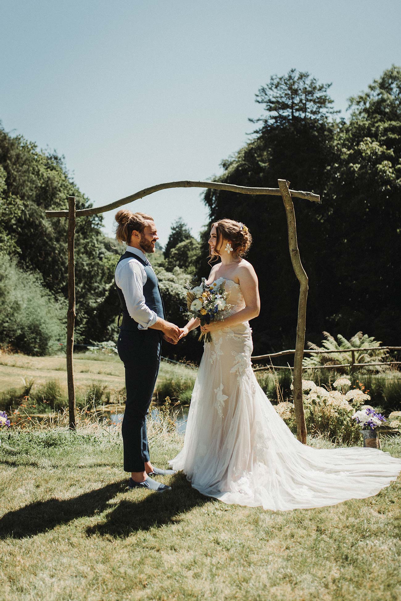The bride and groom are the epitome of sweet summer love. From the floral accents of the groom’s ensemble to the bloom-filled embellishment of the bridal gown and earrings, the couple carry the romance of the garden setting as they take a loved-up stroll through the sun-kissed gardens of this captivating country idyll.