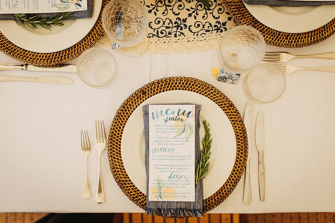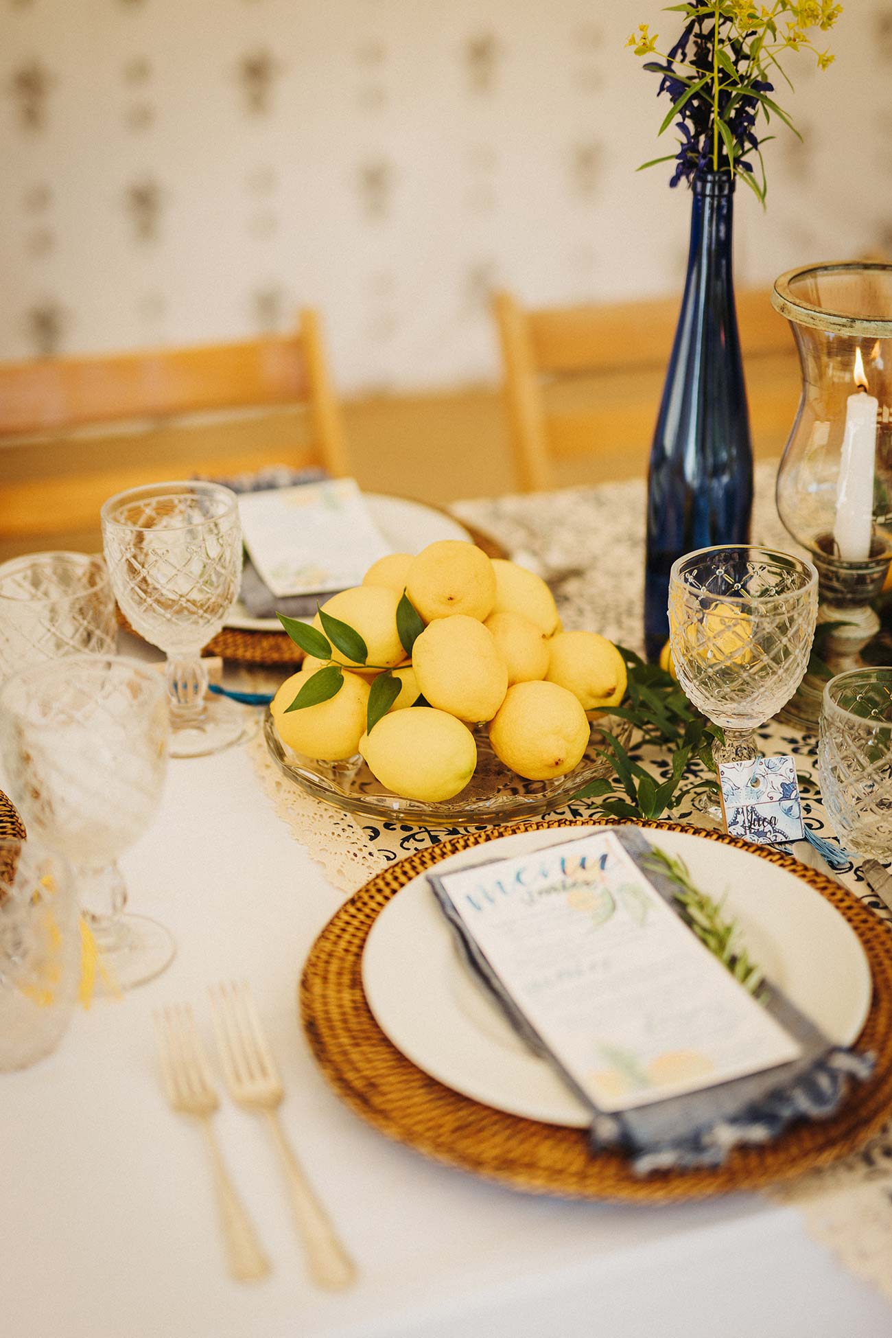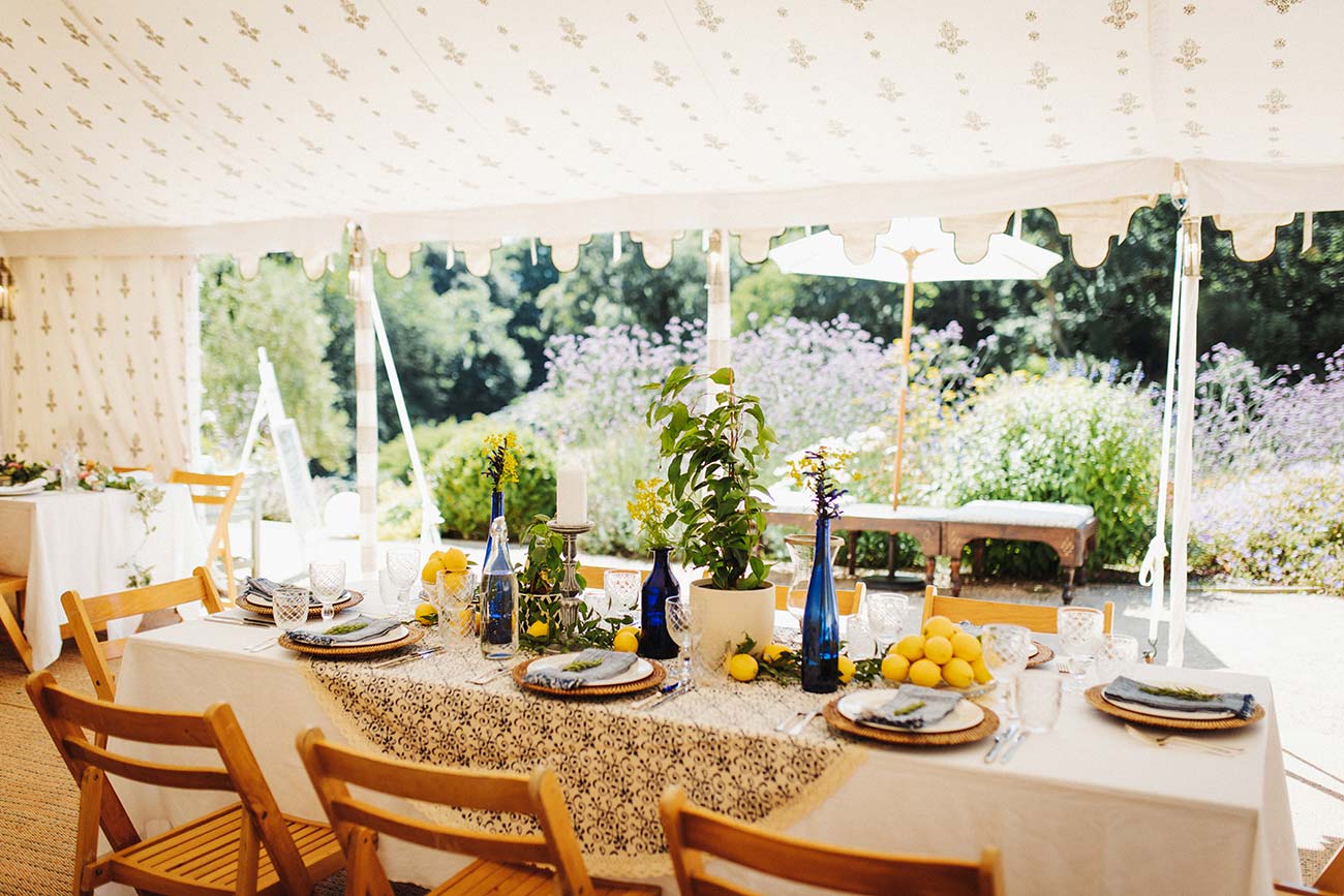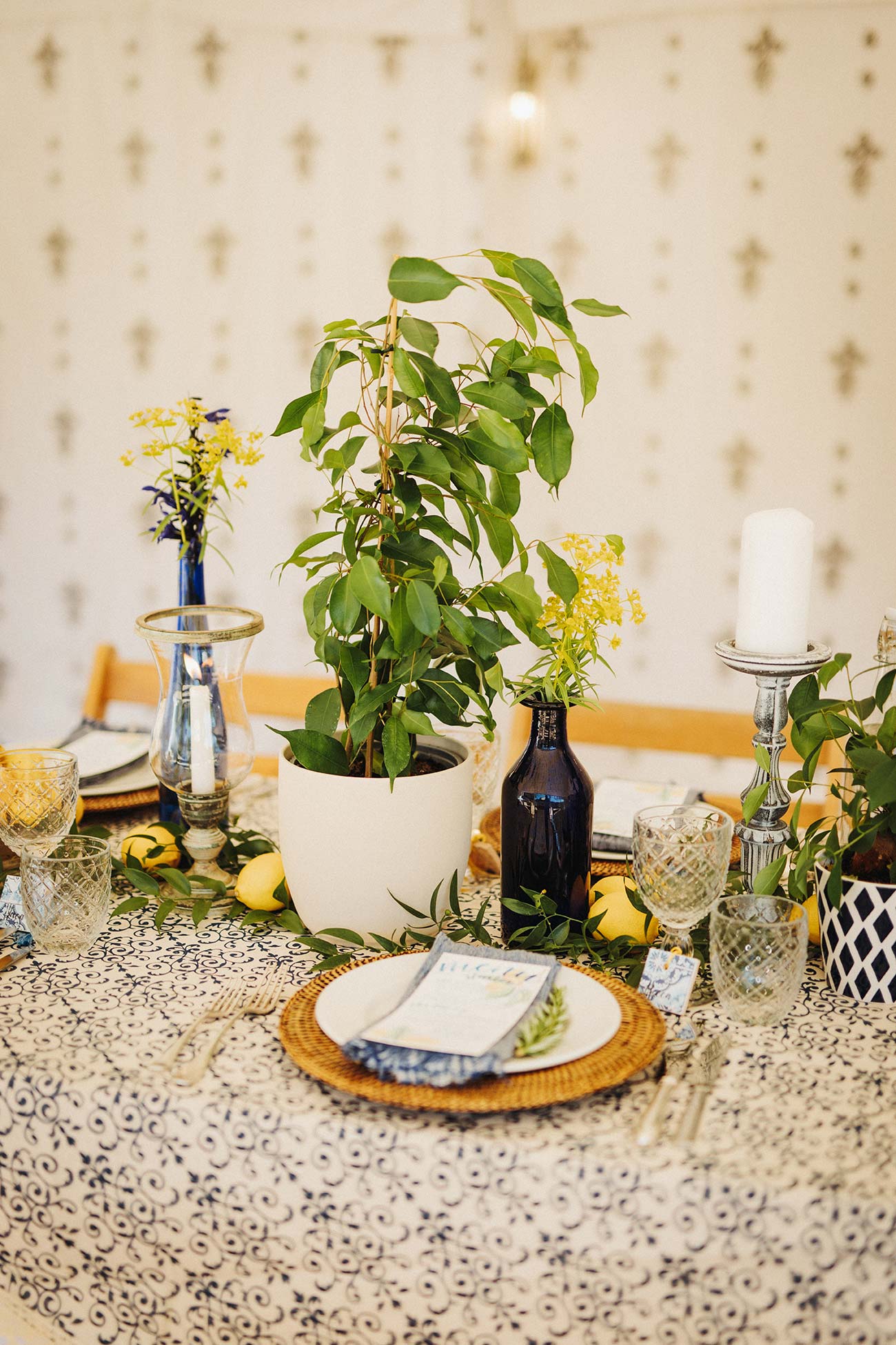 Rich in Mediterranean influences, a palette of zesty yellows and bold blues pop against crisp whites and clean lines. “We wanted to celebrate the essence of summer, drawing on the blue and white of the summer skyline and yellow hues from the summer sun,” explains coordinator and stylist Hazel Parsons of Out of the Ordinary Weddings (outoftheordinaryweddings.com). “We added garden herbs, citrus fruits, greenery from the garden, pot plants and candles to create an Italian kitchen garden feel.”