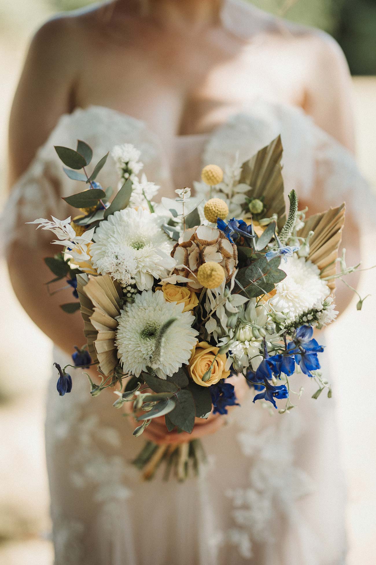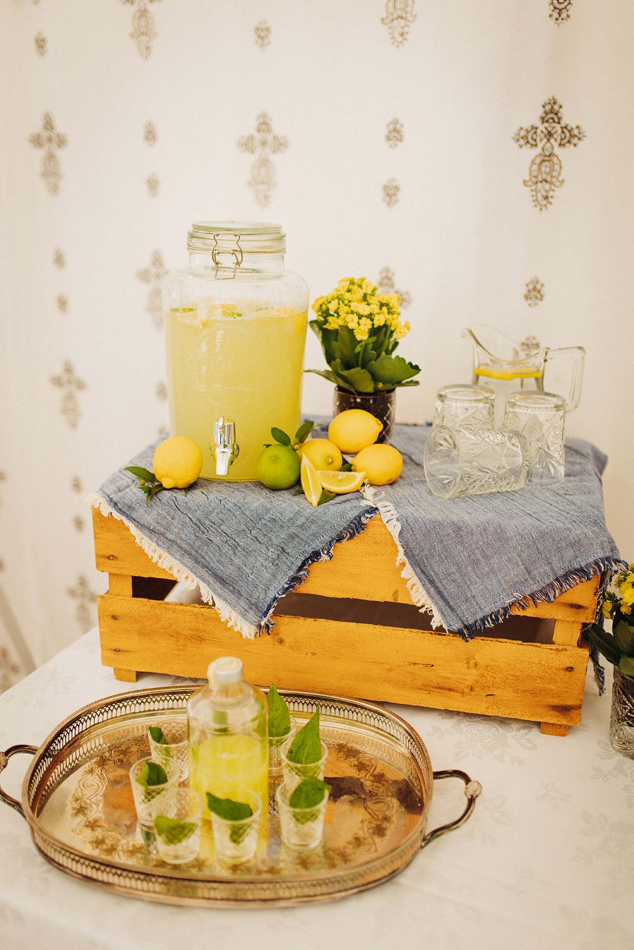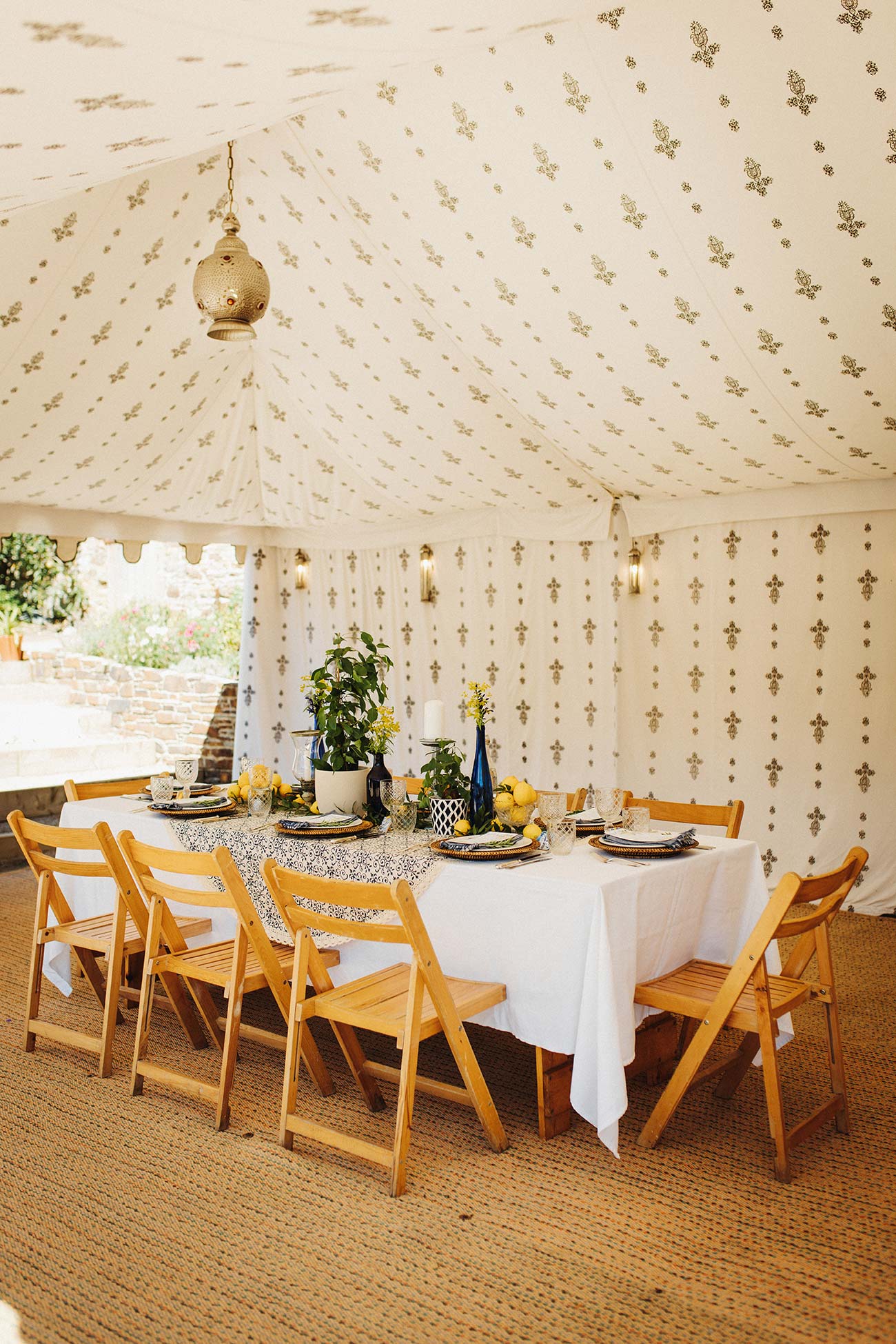 Rich in Mediterranean influences, a palette of zesty yellows and bold blues pop against crisp whites and clean lines. “We wanted to celebrate the essence of summer, drawing on the blue and white of the summer skyline and yellow hues from the summer sun,” explains coordinator and stylist Hazel Parsons of Out of the Ordinary Weddings (outoftheordinaryweddings.com). “We added garden herbs, citrus fruits, greenery from the garden, pot plants and candles to create an Italian kitchen garden feel.”