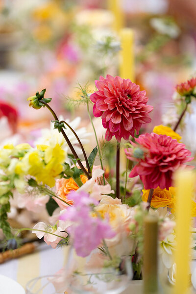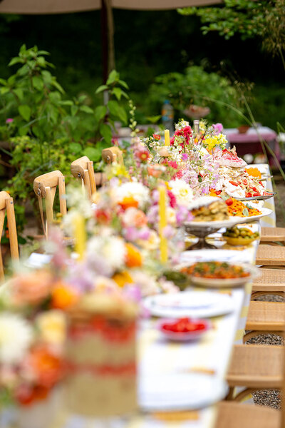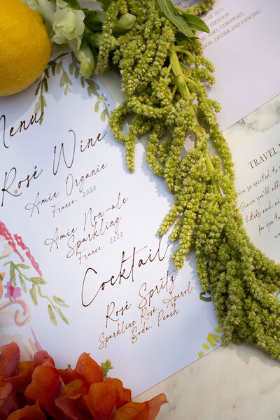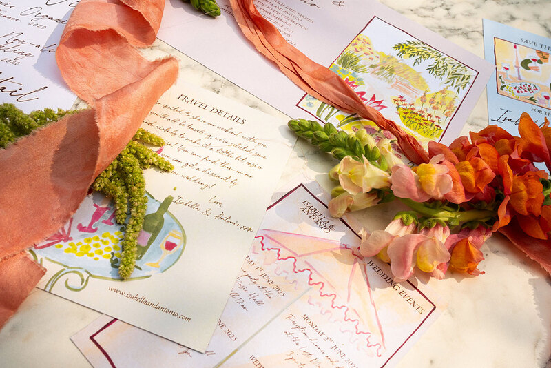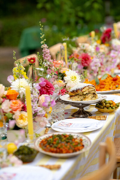 “Textures and colours were carefully curated, drawing on a warm, Mediterranean-inspired palette of terracotta, olive green, butter yellow, soft pink and peach,” explains Sophie. “Complementary stationery and tableware were selected with intention, while guests followed a playful garden party dress code to enhance the relaxed, joyful atmosphere,” adds Jessica.