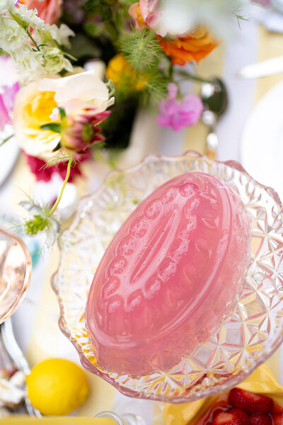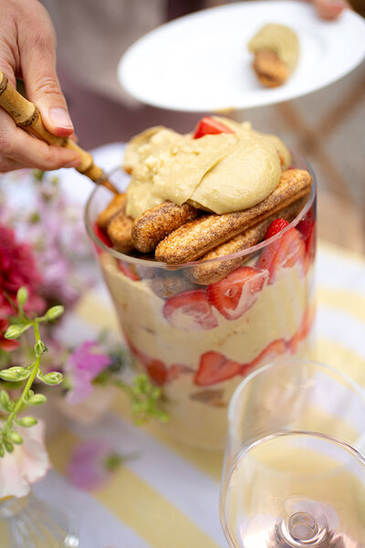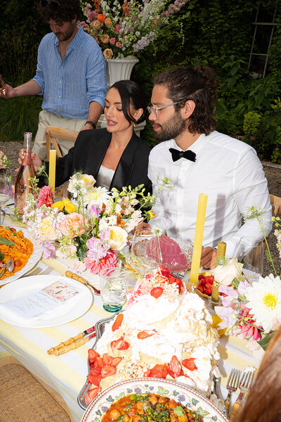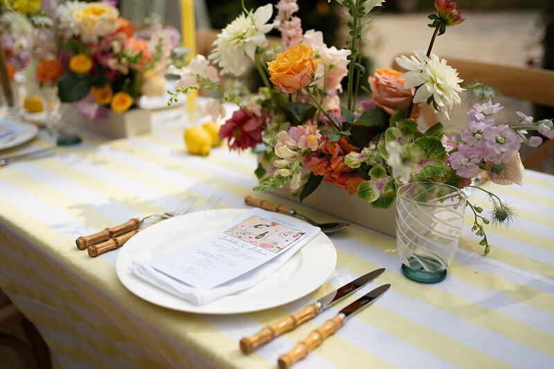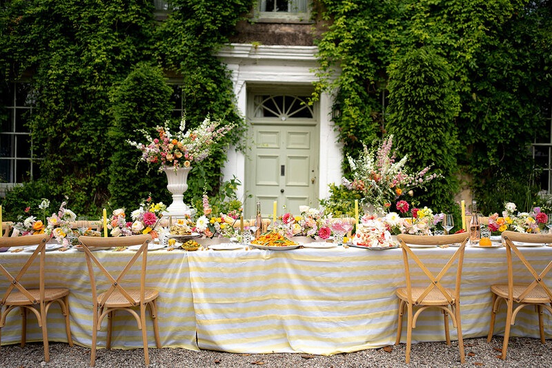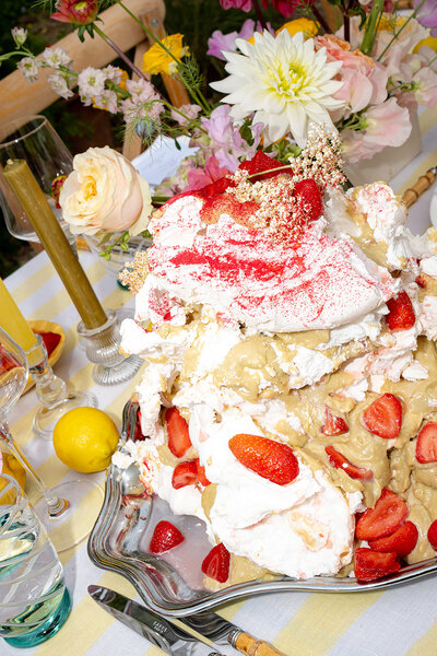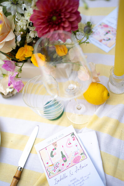 Florals are central to the look: abundant, untamed arrangements cascade across tables layered with lemon-striped linens, butter yellow candles and whimsical stationery. The menu, meanwhile, sings of Italy – generous and vibrant. Think decadent lasagne, tiramisu and meringues, strawberries lavishly topped with cream, and sparkling cocktails of rosé, Aperol, soda and peach.