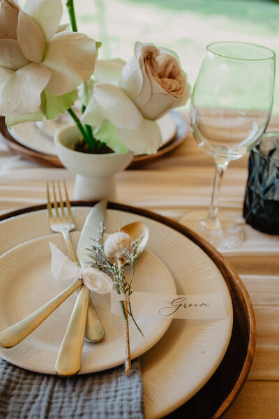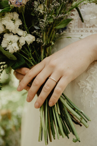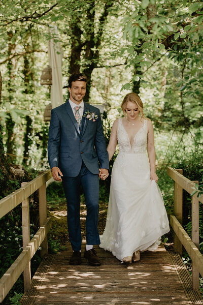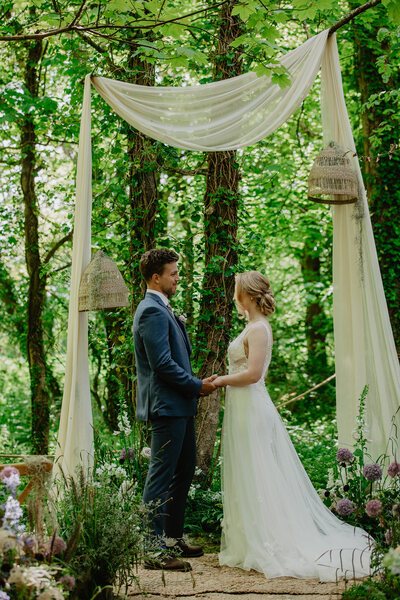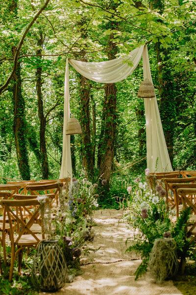 This styled shoot captures the untouched beauty of the landscape. A lush woodland glade becomes the ceremony backdrop, where dappled sunlight pours through the canopy, casting a golden glow over the scene. A simple altar of soft ivory fabric draped between the trees sets the effortlessly romantic mood, with woven rattan pendant lights lending a touch of bohemian charm. It’s here a celebrant leads a soulful hand-tying ceremony. “The Celtic traditions seamlessly blended with the natural surroundings, making the moment feel even more meaningful and timeless,” says Jess Baber of Tide the Knot, who coordinated and styled the shoot.