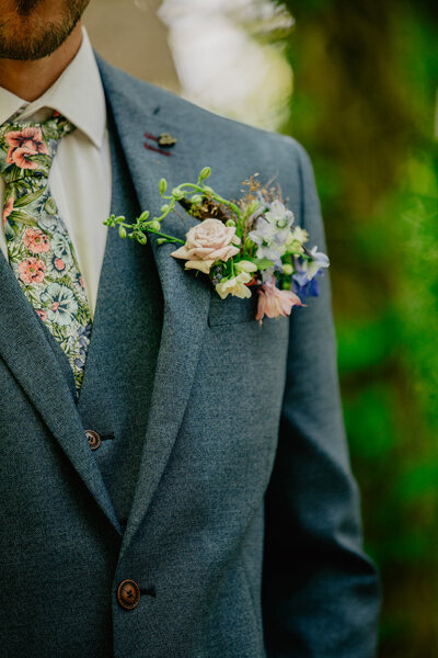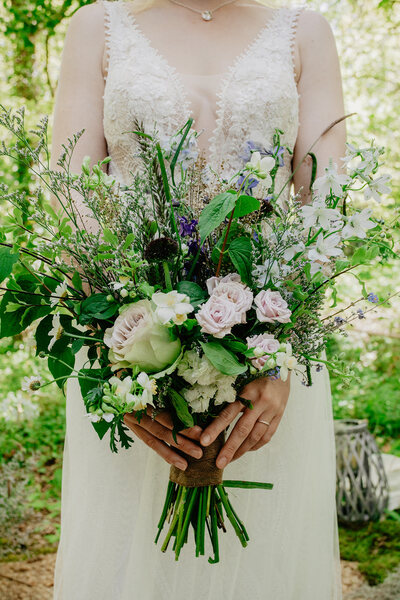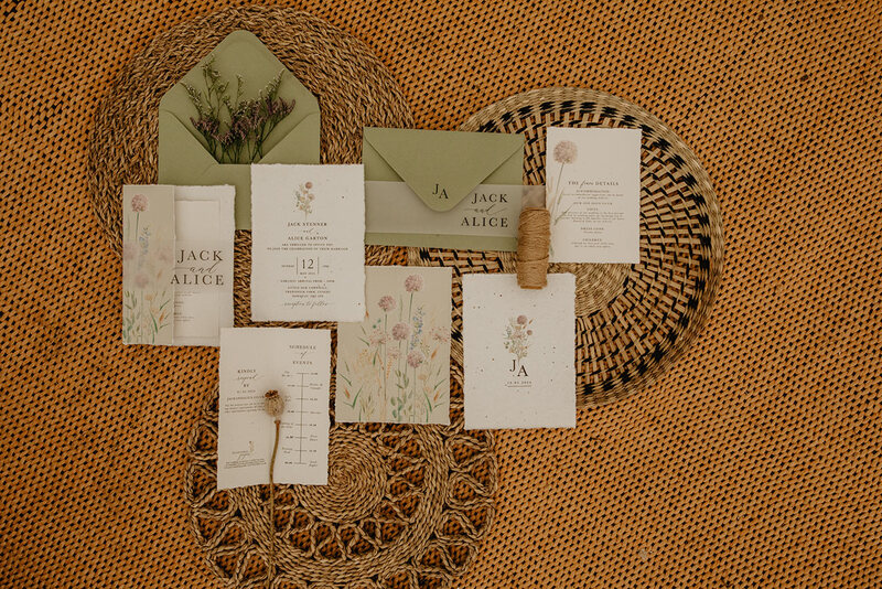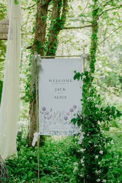 Florals take centre stage, enhancing the organic, enchanted-forest aesthetic. “The wild, natural florals in muted purples, whites and greens creates a dreamy atmosphere and complements the earthy tones of the surroundings,” says Jess.