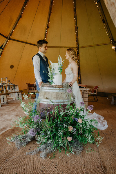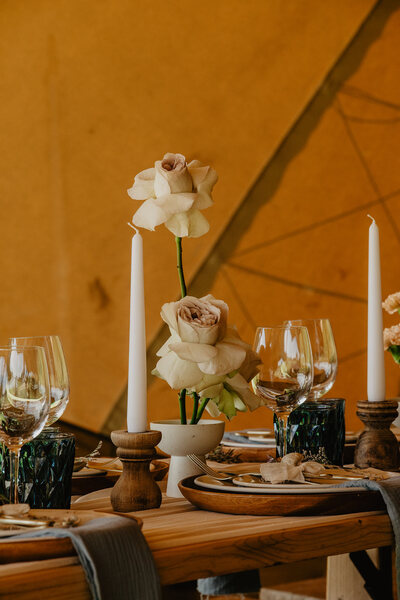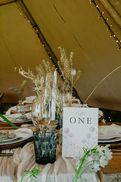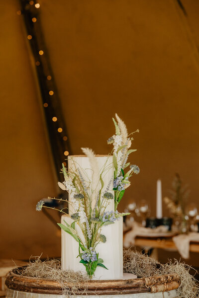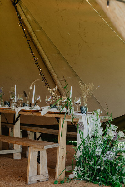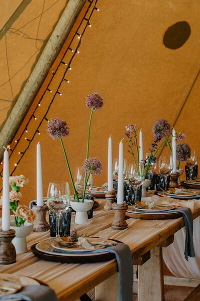 The reception unfolds in the meadow, where a Nordic giant hat tipi nestles into the landscape, its open sides framing panoramic views across the surrounding countryside. Inside, rustic elegance meets bohemian charm, with flowing fabric runners, natural-toned tableware, dusty blue linen napkins and ceramic vases brimming with alliums and soft lilac blooms. Fairy lights twinkle above and slender white candles in wooden holders glow with soft candlelight. “With its natural textures and thoughtful details, this set-up is perfect for a wildly intimate gathering, blending simplicity with refined sophistication,” adds Jess.