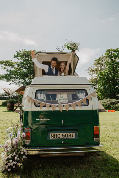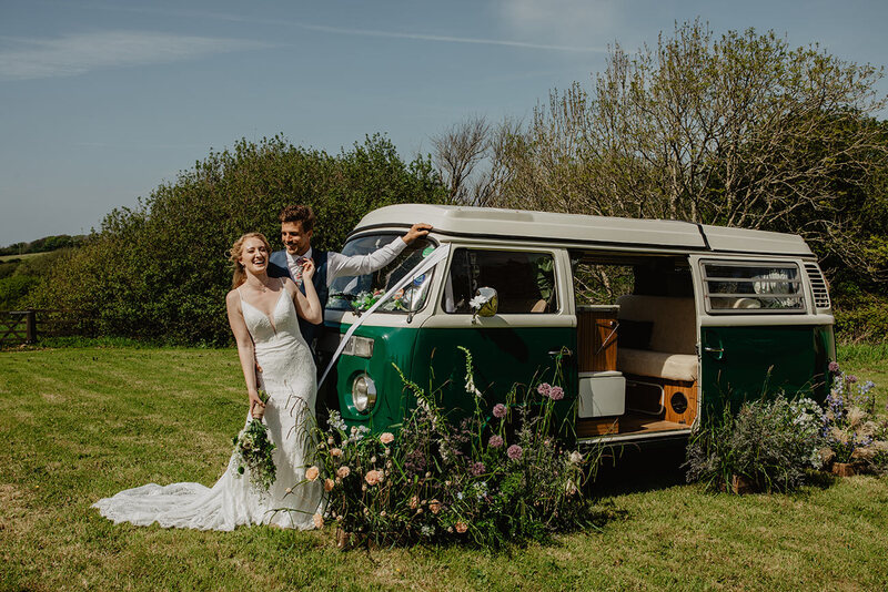 A vintage VW campervan brings a free-spirited, nostalgic spirit, while glamping pods – all chic design and luxe comfort – offer a stylishly snug retreat for the wedding night. The perfect, starry-eyed ending to a whimsical celebration in the Cornish wilds.