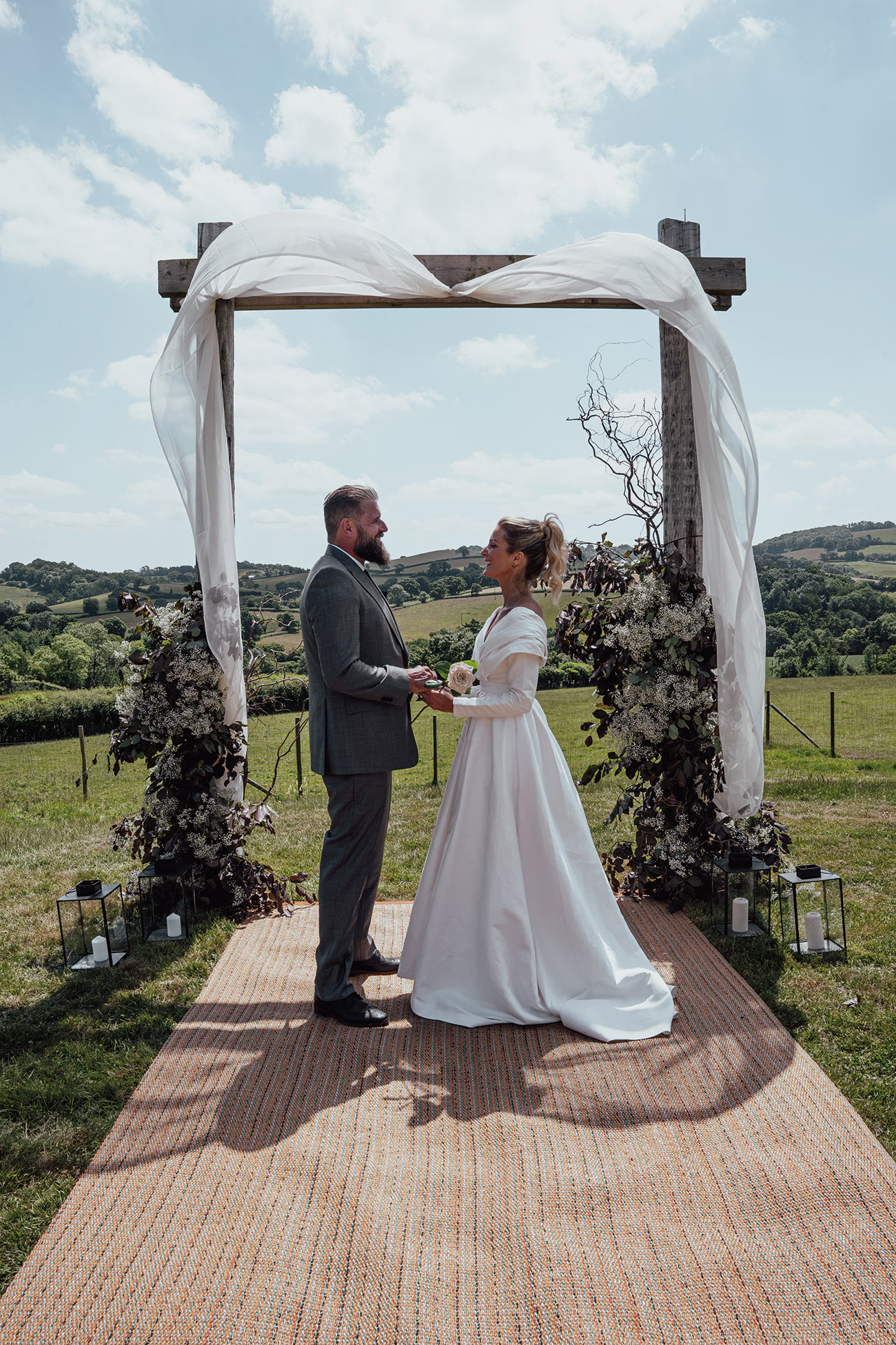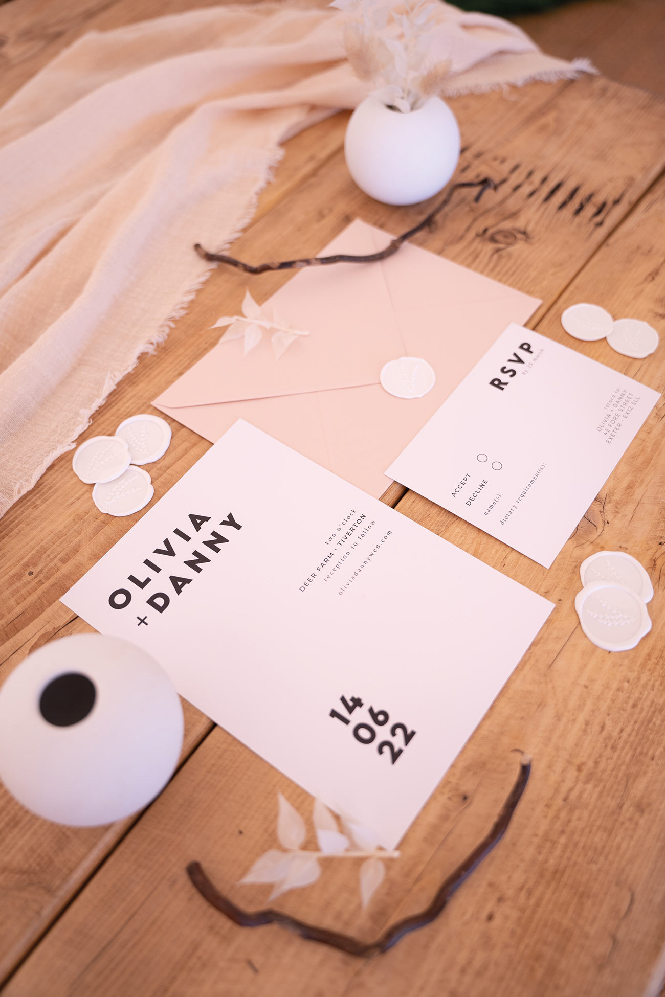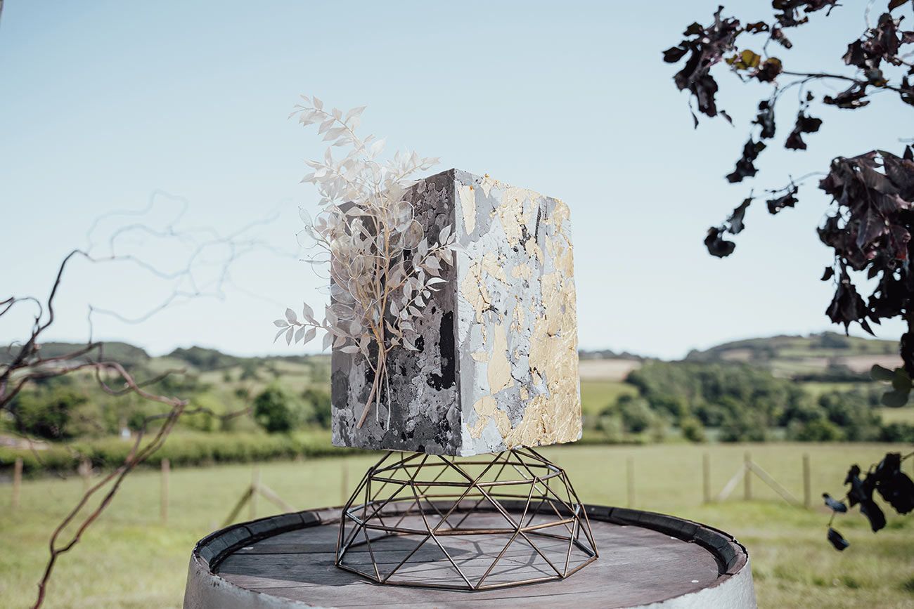 “We wanted to showcase a modern style that complements the Devon countryside while drawing inspiration from the contemporary industrial aesthetic of the surrounding luxury accommodation and history of the farm,” explains Stacey Gray of Glas Events, who coordinated and styled the shoot. “Much consideration went into working with local, ethical small businesses and showcasing the incredible talent of those in the south-west.”