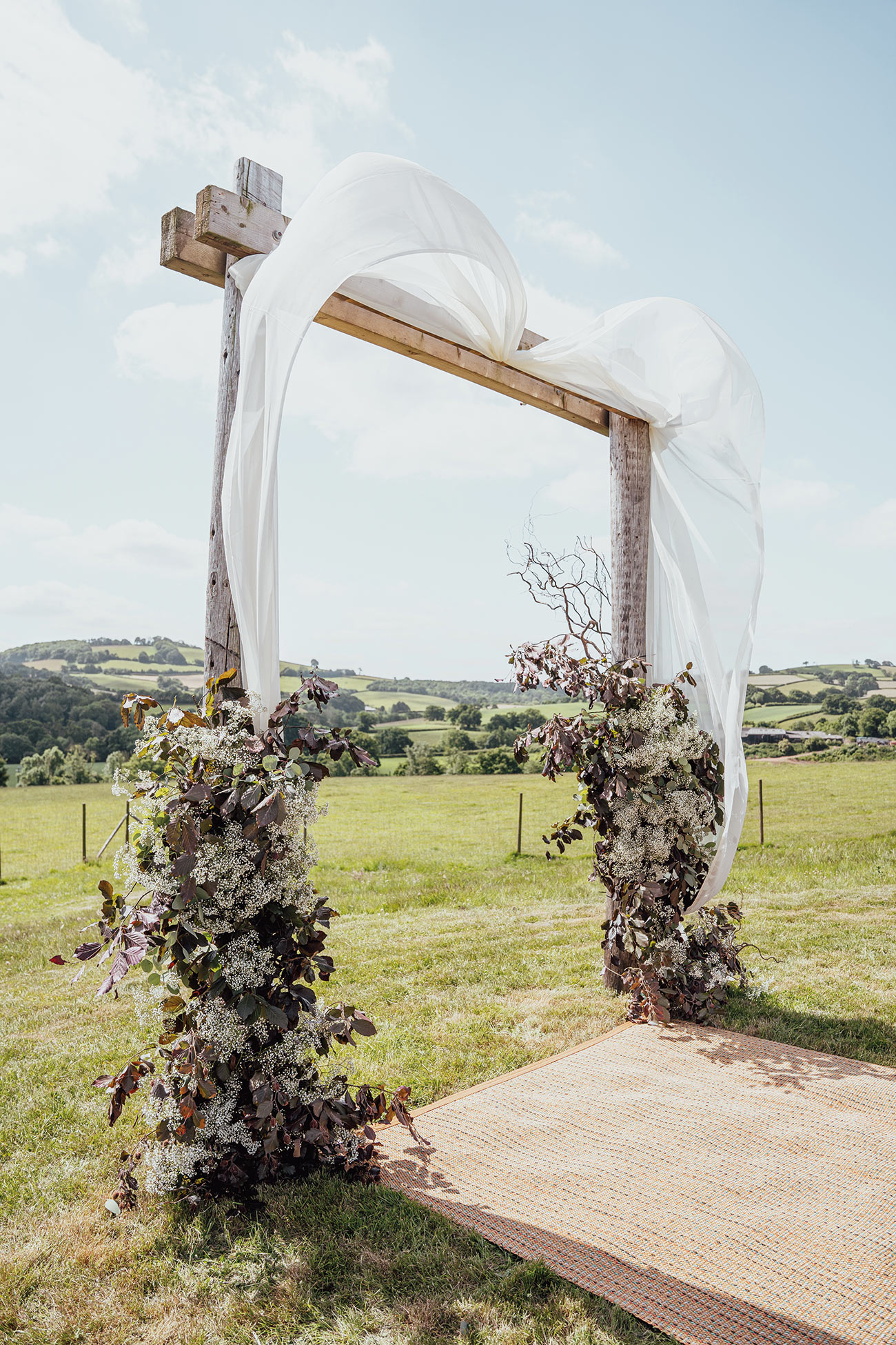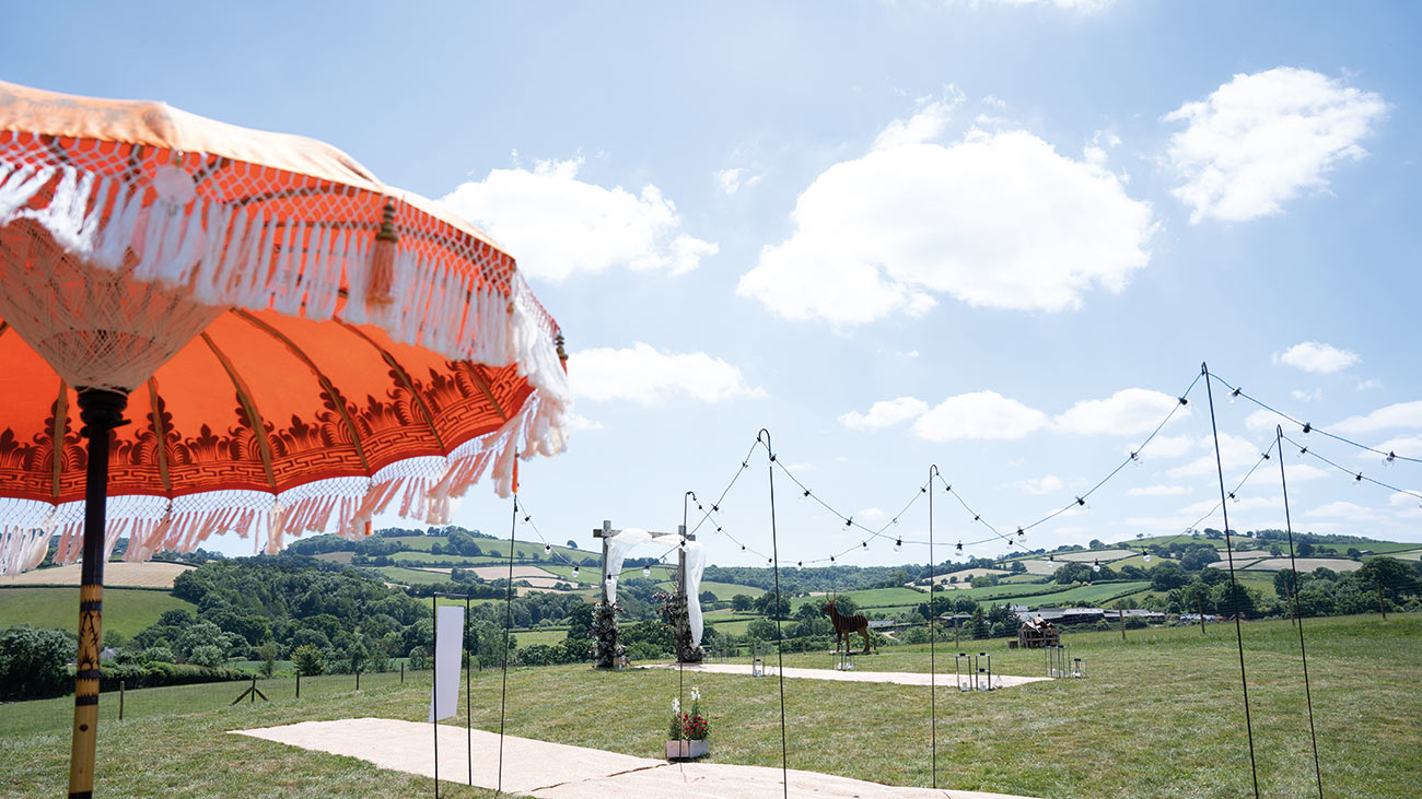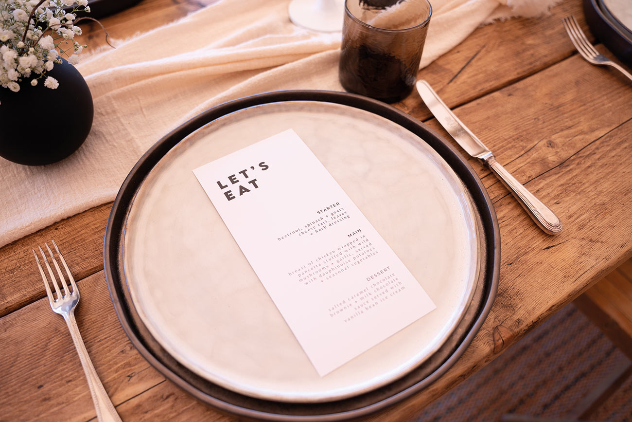 “We wanted to showcase a modern style that complements the Devon countryside while drawing inspiration from the contemporary industrial aesthetic of the surrounding luxury accommodation and history of the farm,” explains Stacey Gray of Glas Events, who coordinated and styled the shoot. “Much consideration went into working with local, ethical small businesses and showcasing the incredible talent of those in the south-west.”