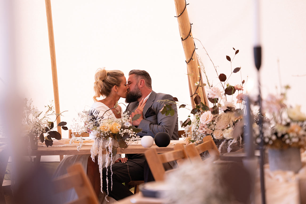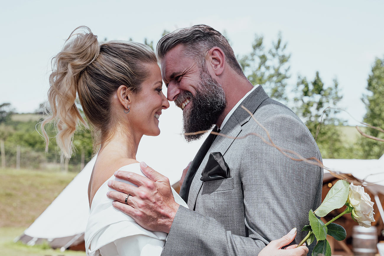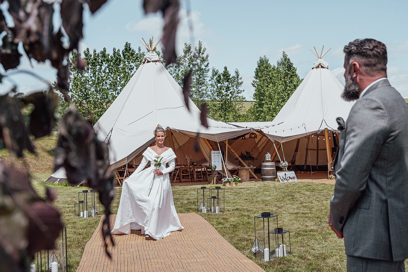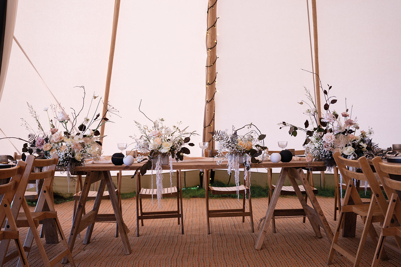 Set in a rural locale and hidden amongst Devon’s rolling hills, Deer Farm Tipi Weddings offers a blissfully secluded setting for a wedding with breathtaking views across meadows roamed by the resident deer. In this styled shoot, the venue’s off-white tipis provide a striking venue space that blurs the lines between natural and industrial.