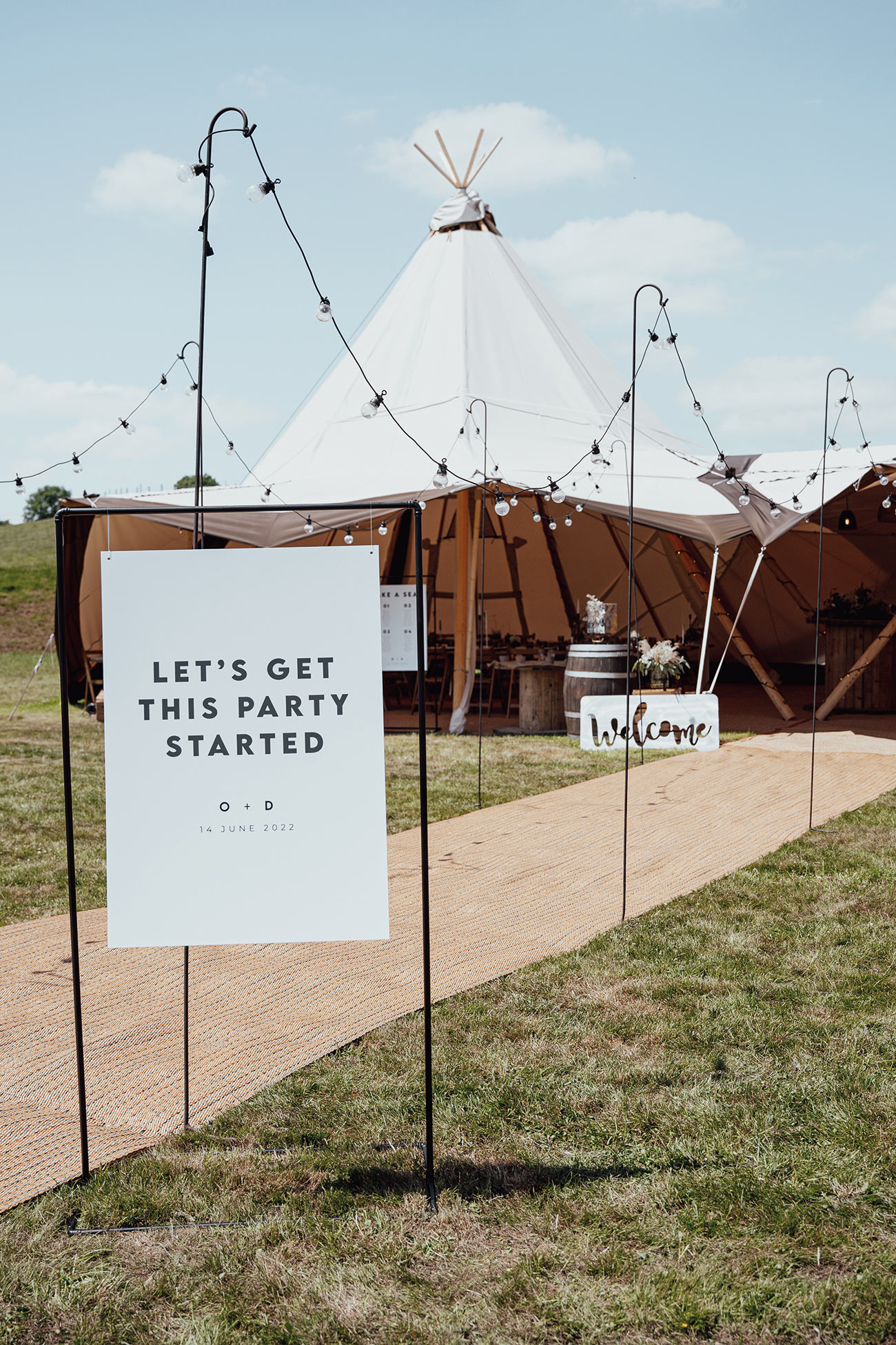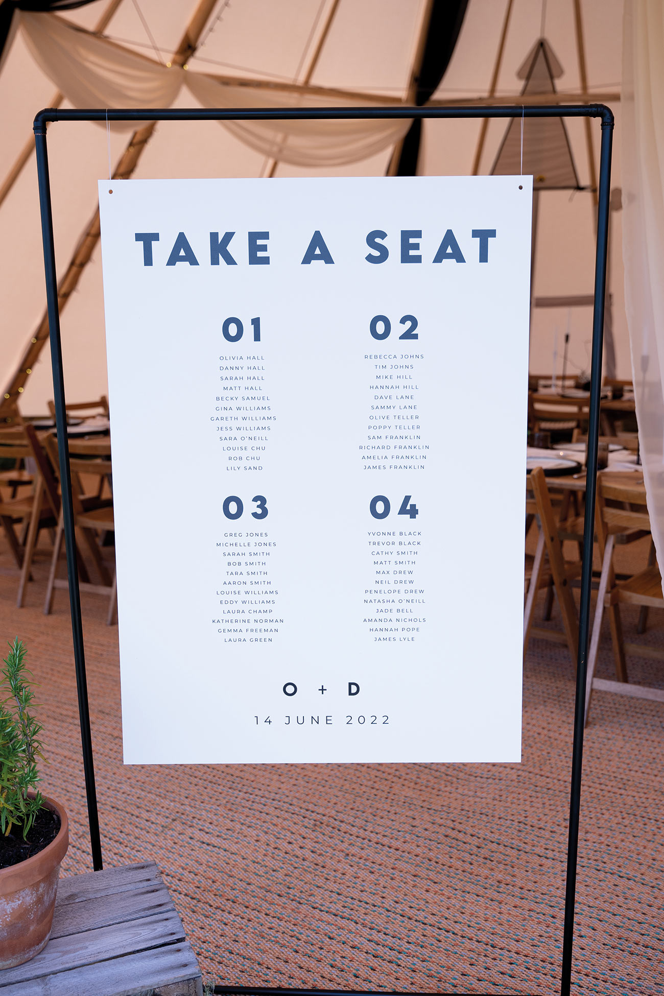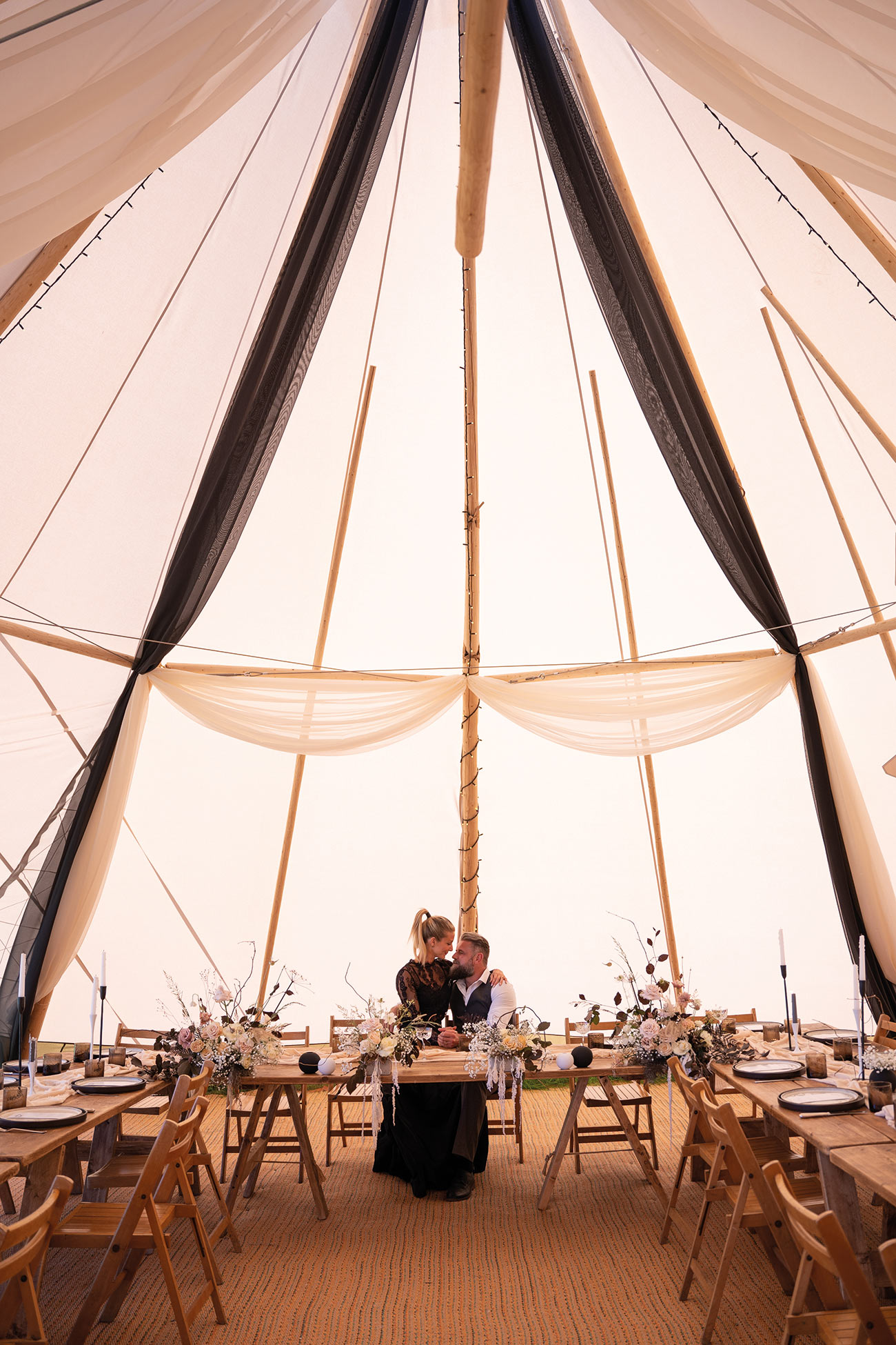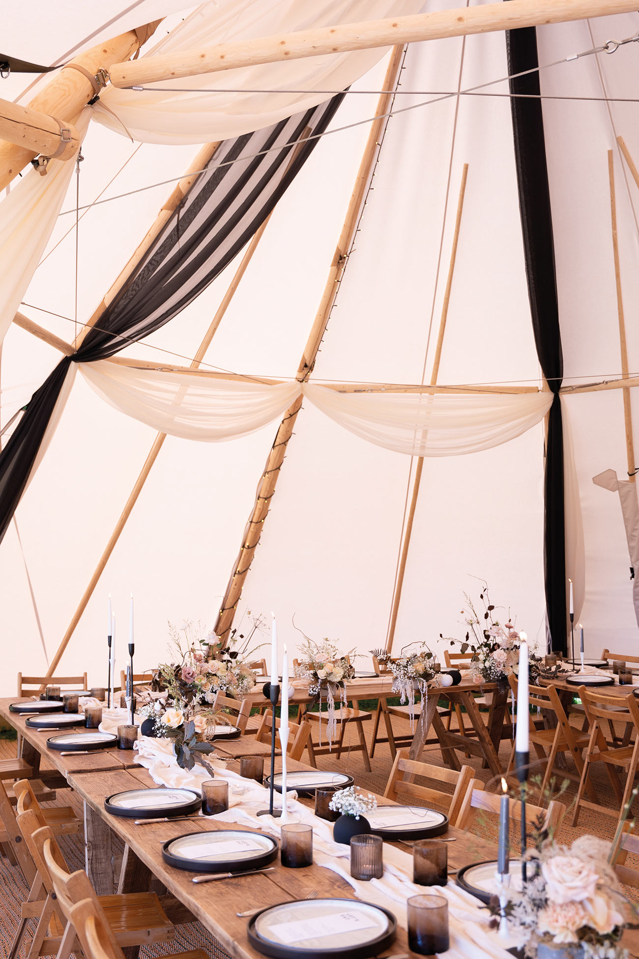 Pillar candles in glass lanterns line the aisle to an arbour, dressed in dainty white blooms, foliage and billowing drapes, that frames the scenic countryside beyond. The far-reaching views and natural textures inside the tipis provide a timeless canvas for the contemporary aesthetic, where striking black accents, which are woven throughout the décor, are softened with a soothing palette of off-whites, oatmeal and oyster. Every element of the design, from the stationery to the cake, carries the clean lines and bold use of colour.