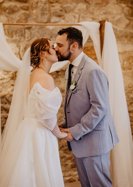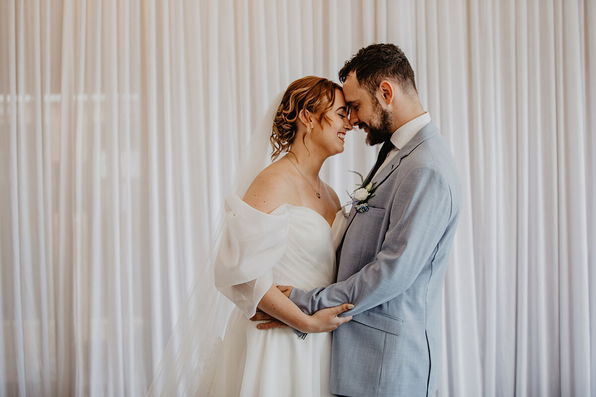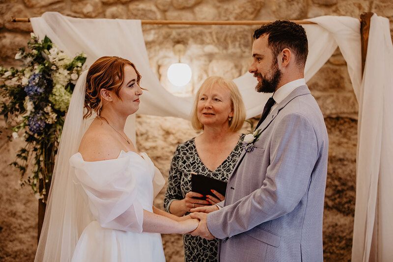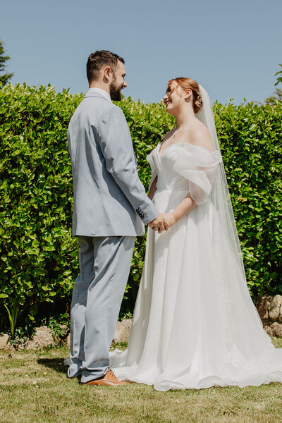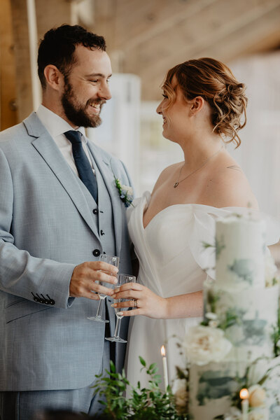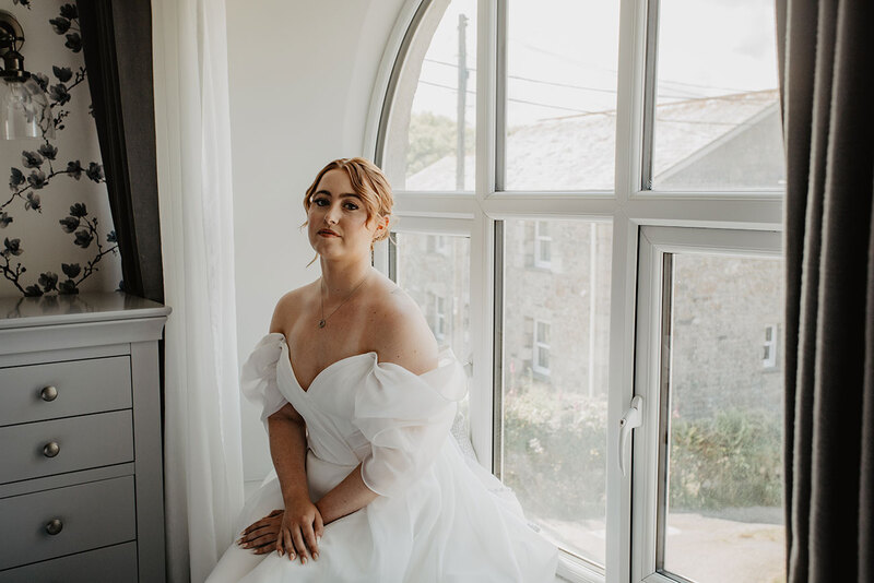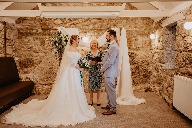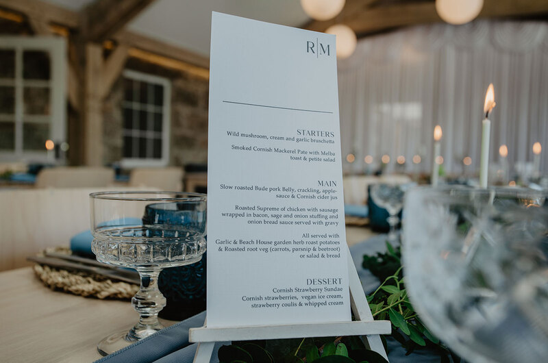 Perfectly complementing both the bride and wedding scene, the groom’s light blue three-piece and dark blue tie serves as another nod to Polmanter’s prime position with views across the ever-spectacular St Ives Bay.