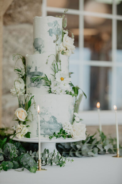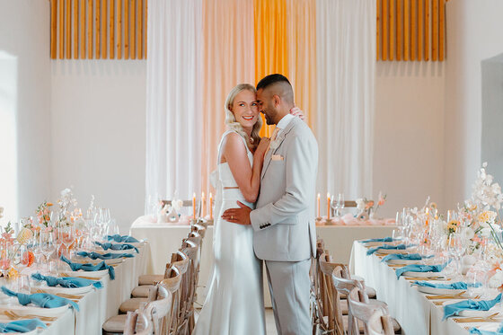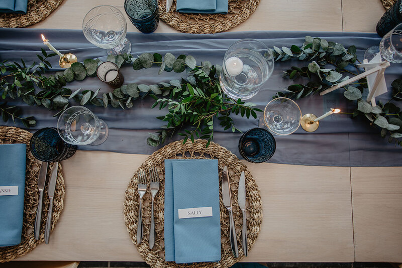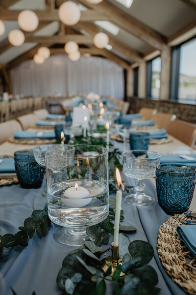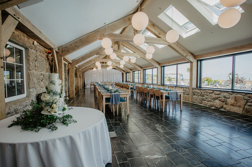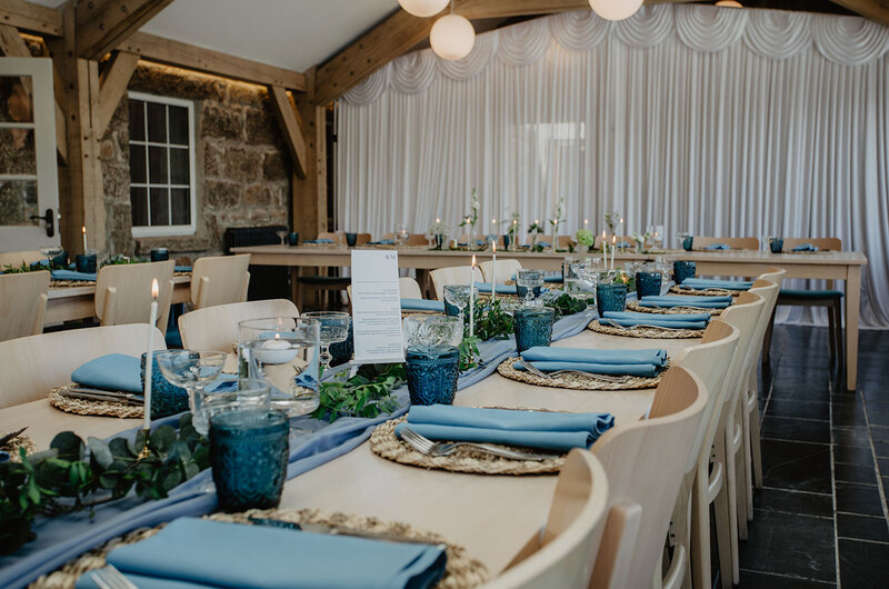 The conservatory provides the light and airy reception space: a clean and textured mix of exposed oak beams and granite, slate flooring and contemporary circular ceiling lights. The tables are adorned with brushed blue table runners, sprigs of foliage, brass candlesticks, mismatched vintage champagne coupes and dark blue tumblers alongside seagrass rattan charger plates topped with sky blue napkins. Hugged by a leafy meadow, a statement cake featuring textured buttercream and fresh flowers assumes centre stage.