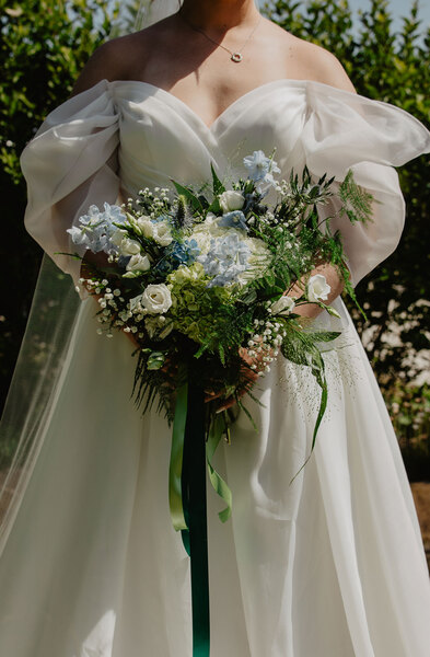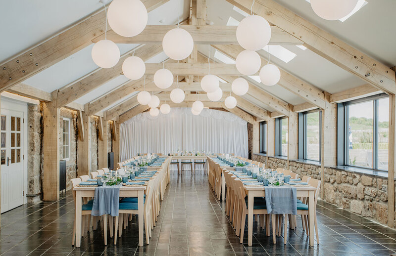 Blousy blooms, leafy foliage and a colour scheme blending the new neutrals with rich forest green and marine blues makes for an elegant wedding scene at Polmanter. Drawing on the rural romance of the west Cornwall setting, with its elevated views across the ocean, rustic elements fuse with modern detailing to create an understated yet chic look. From the tablescapes to the bridal wear, the design reflects the country-meets-coast setting, with sea blues spliced into the reception space adding an ethereal feel.