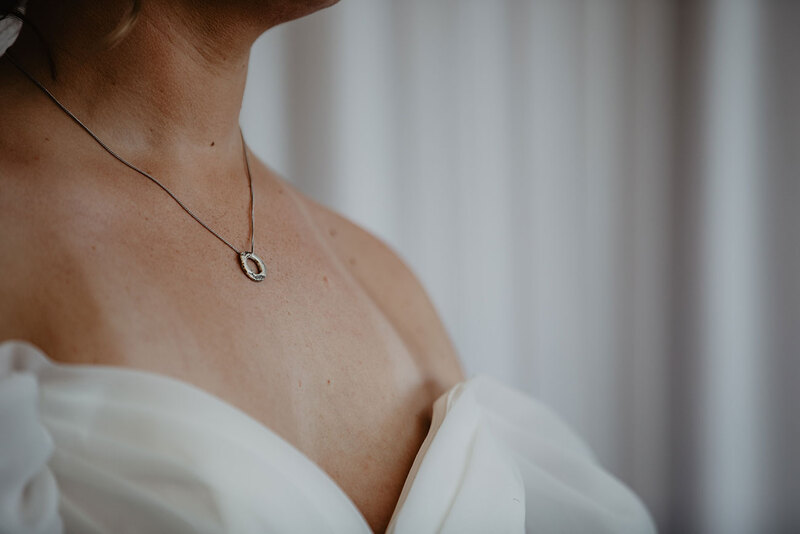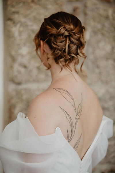 Back to the bridal wear: an elegant off-the-shoulder gown with draped bodice beautifully blends modern fairytale with classic romance. Accompanied by a cream, green and frosted blue bouquet, a gorgeously loose updo with falling waves and sandcast jewellery reflects the recurring coastal theme.