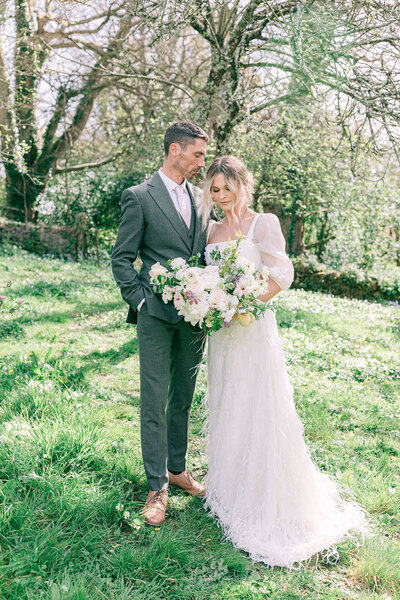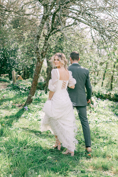 The bridal look is pure romance, with a dance-ready gown featuring floral embroidery, delicate feathers and beads, complete with gauzy puff sleeves, a square neckline and lace-up back – a dreamy blend of boho, retro and modern couture. A loose updo adorned with a floral headpiece, pearl-drop earrings and a blousy bouquet complete the look with an air of effortless romance. Not to be outdone by his bride, the groom wears a green wool three-piece suit, tan leather brogues and a petal-pink tie, complementing the fresh, nature-inspired palette.