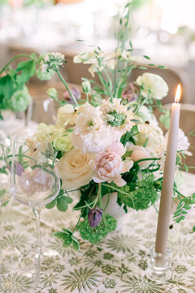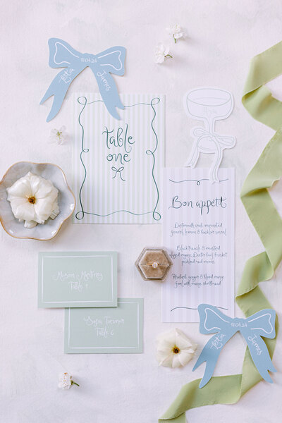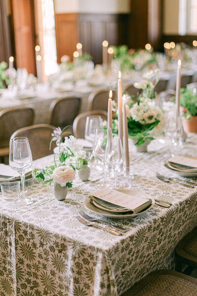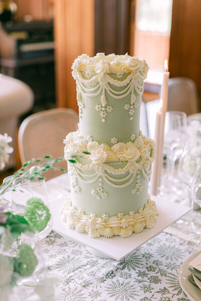 The tablescape is effortlessly elegant, with a dainty printed tablecloth, bare rattan chairs and pastel pink tapered candles in glass votives evoking soft, pastoral charm. Illustrated stationery with ornate calligraphy and a two-tier moss green cake with intricate royal icing add a vintage-kitsch, homespun aesthetic, striking the perfect balance between refined and whimsical.