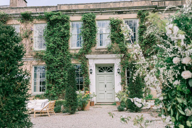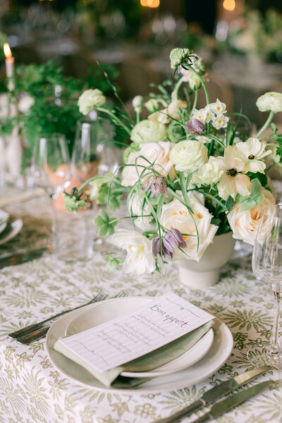 The styling is a love letter to spring, with lush greens, creamy whites and mauve and rose-pink tones woven through the florals and décor, echoing the gardens bursting to life with paper-white daffodils and fritillaries. Potted floral displays and a statement floral floral centrepiece frame the entrance and aisle, while inside the wood-panelled dining room, the low-level, delicate floral arrangements add to the air of understated romance.