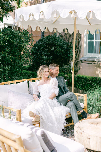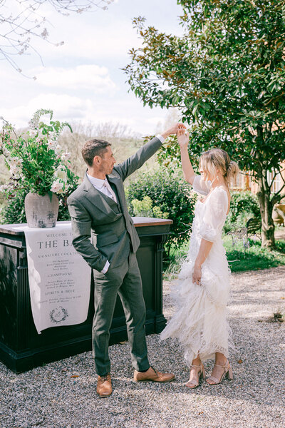 As the sun spills across the gardens, the couple kicks back in relaxed style, enjoying al fresco cocktails under the pergola, cutting the cake and twirling into their first dance beneath the spring sky.