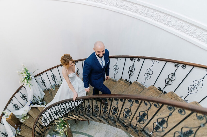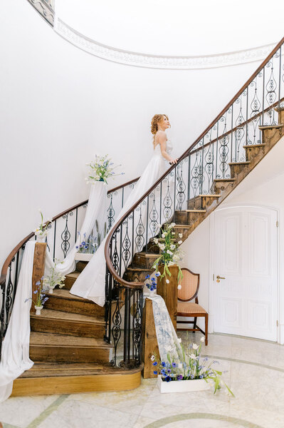 The grand staircase is adorned with flowers and drapes that enhance the sense of romance, while the cake continues the botanical theme: a four-tiered extravaganza adorned with blue ruffles and 3D petals reminiscent of a bridal gown. Floral arrangements take eclectic form and range from petite posies in vases and atop wooden flower stands to small troughs spilling blooms onto the floor.