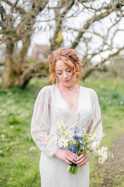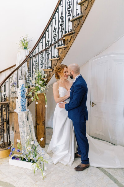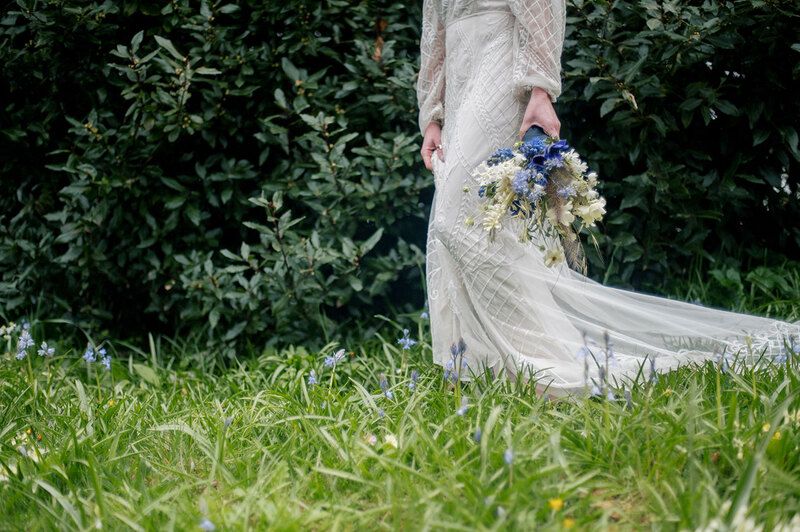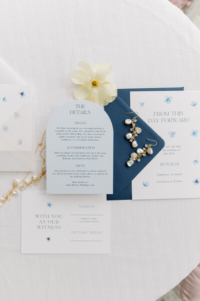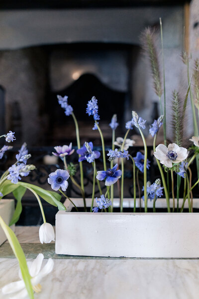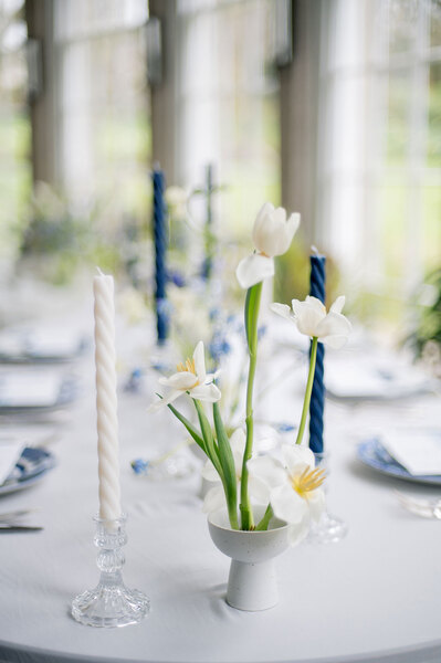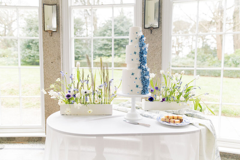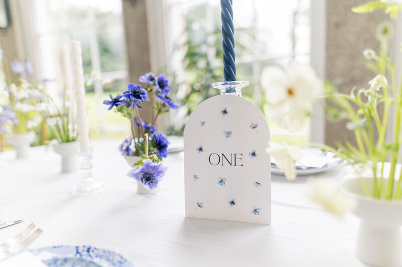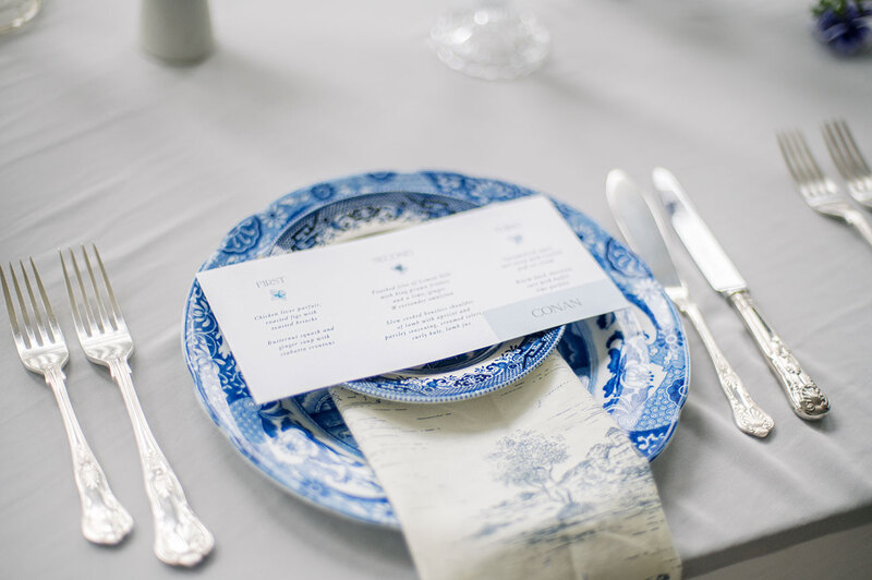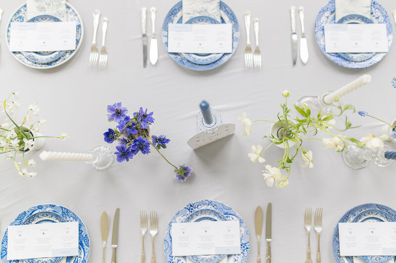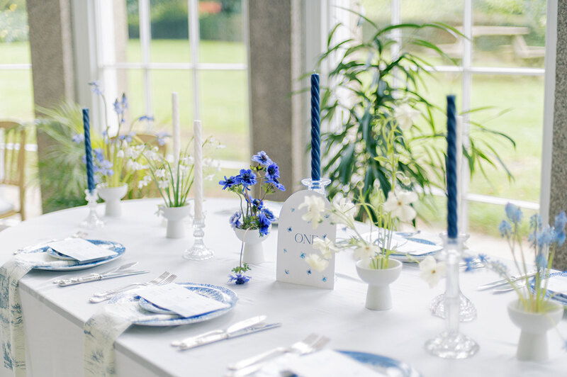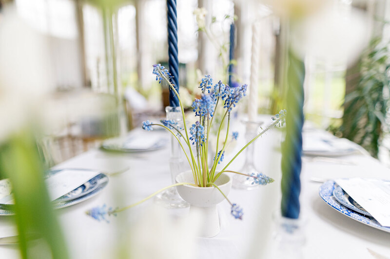 Blue and white take centre stage in this fresh and inviting styled shoot at Roswarne. Complementing the period features and charm of the historic house, the styling draws upon and accentuates the building’s light-filled spaces and elegant interiors. Blooms in varying shades of blue are scattered throughout the venue and tabletops, blending the inside with the scenic outdoors, the blossomy motifs carried everywhere from the stationery to the charger plates and napkins. Clear glassware with tapered textured candlesticks, small vases of blue and white buds and ornate silver flatware blend simple styling with an edge of opulence, lending the scene multiple layers of interest.