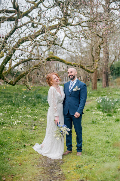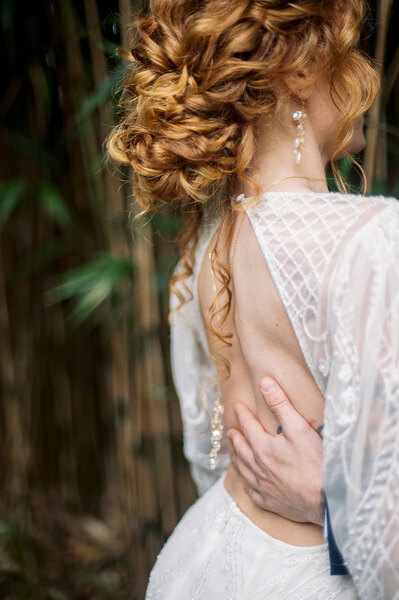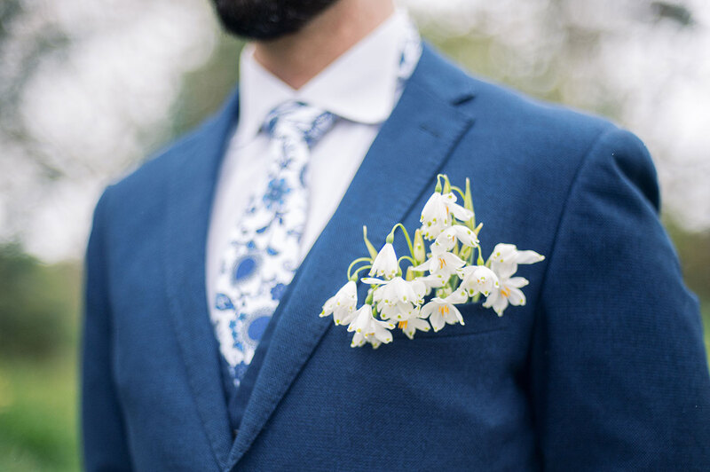 Not to be overshadowed by the décor, the bride and groom are the picture of modern style. His navy blue three-piece suit, floral print tie and matching pocket square, with brown leather loafers, ooze laidback chic, while her strapless sweetheart gown with centre split is the epitome of classic-meets-contemporary glamour. A sweeping train, curly chignon, pearl jewellery and butterfly heels complete the en vogue ensemble. Her second look strikes a more nostalgic tone courtesy of a classic sheer-sleeved V-neck gown with elaborate embroideries. A lariat pearl necklace dangles over the open back and is complemented by pearl drop earrings as the groom swaps his pocket square for a buttonhole of fresh white snowdrops – the treescapes and lush green foliage making a beautiful backdrop to their newlywed embrace.